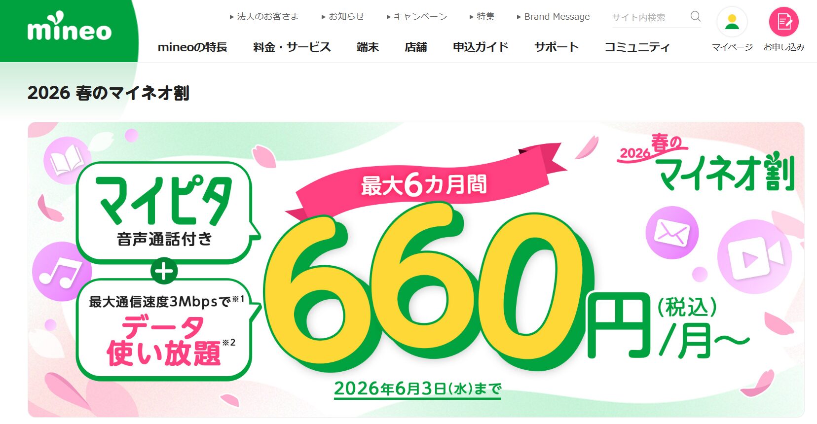 mineo(マイネオ)|2026春のマイネオ割で月額料金が半年間激安