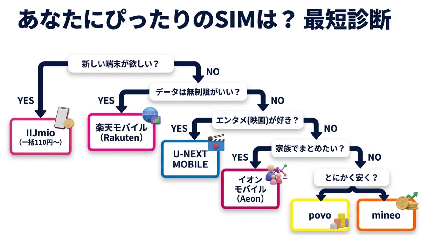 楽天モバイルの14,000ポイント還元やahamoの30GB増量、さらにはメルカリモバイルやU-NEXT MOBILEといった独自性の強いプランの登場によりあなたにぴったりの格安SIMがみつかるはずです。