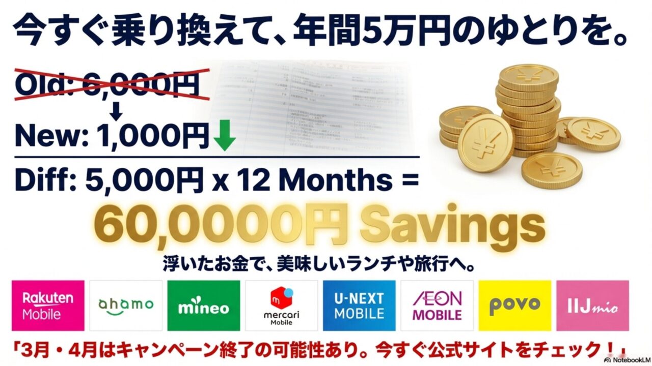 楽天モバイルの最大14,000ポイント還元や、ドコモ回線のahamo、さらに話題のメルカリモバイル1周年祭まで、今この瞬間に乗り換えるだけで年間5万円以上の節約も夢ではありません。