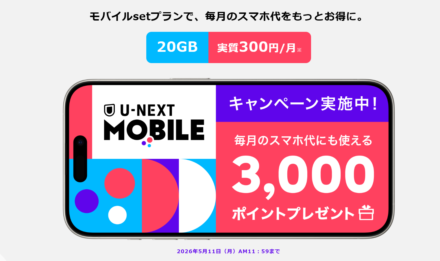 | 料金プラン | 20GB+U-NEXT見放題:3,278円 |