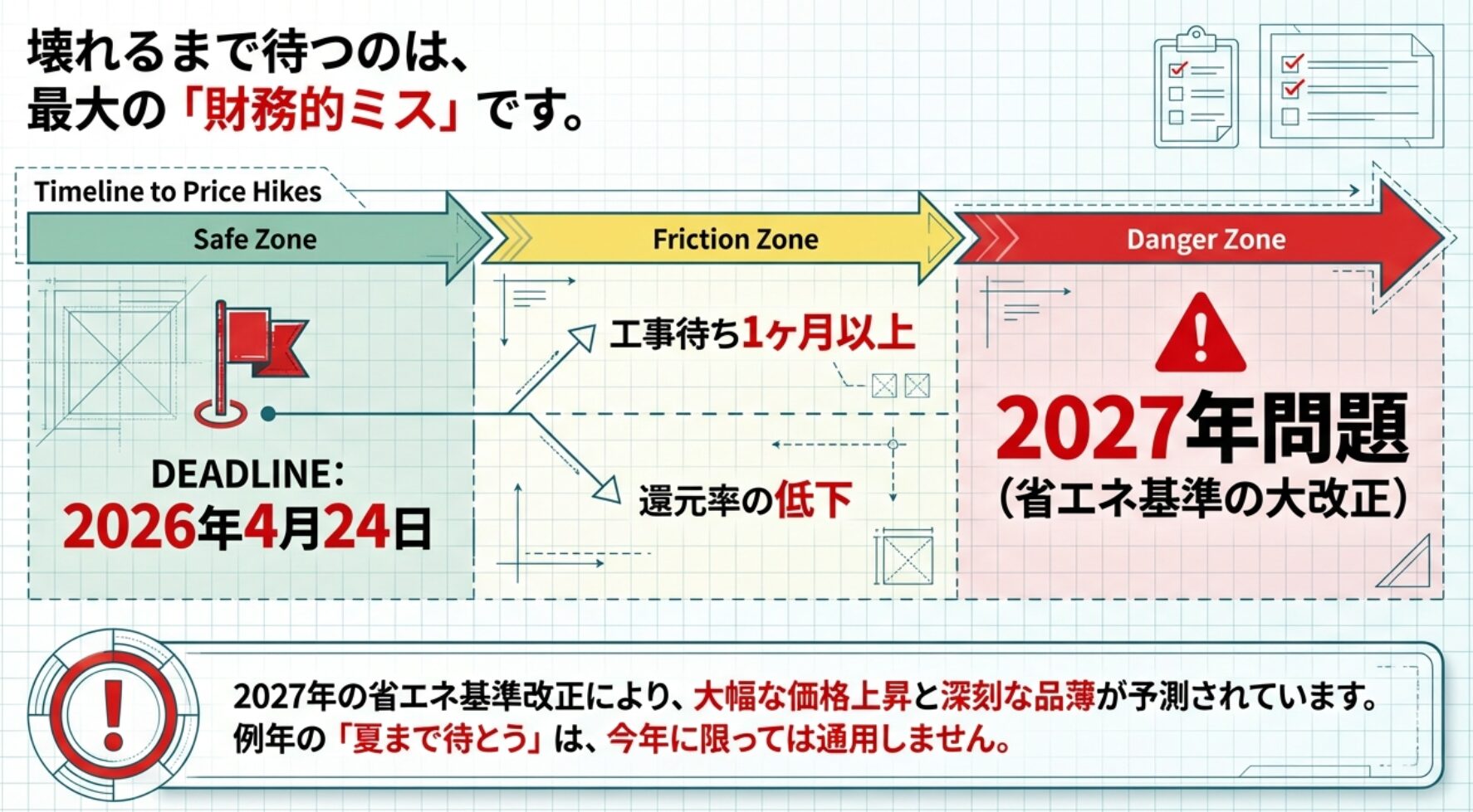来年に迫った「省エネ基準の大改正(2027年問題)」の影響で、エアコンの価格上昇や品薄が予測されているからです。
