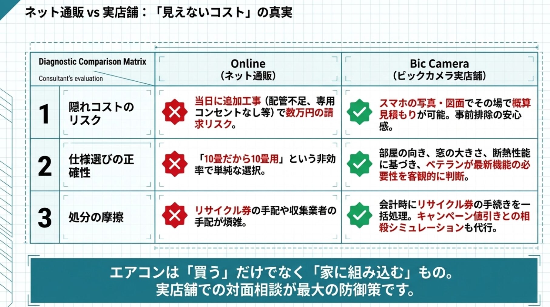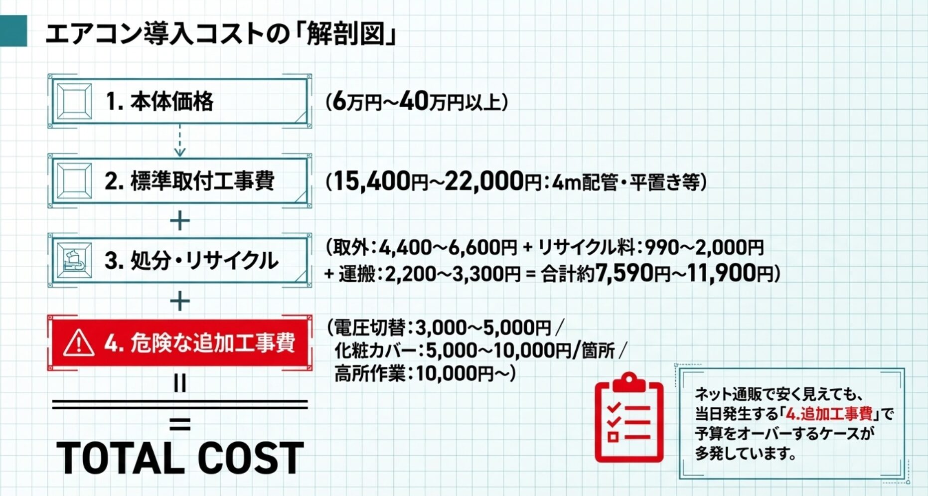 ネット通販の場合、基本工事費は表示されていても、当日に「配管が足りない」「専用コンセントがない」といった理由で数万円の追加料金が発生する場合があります。