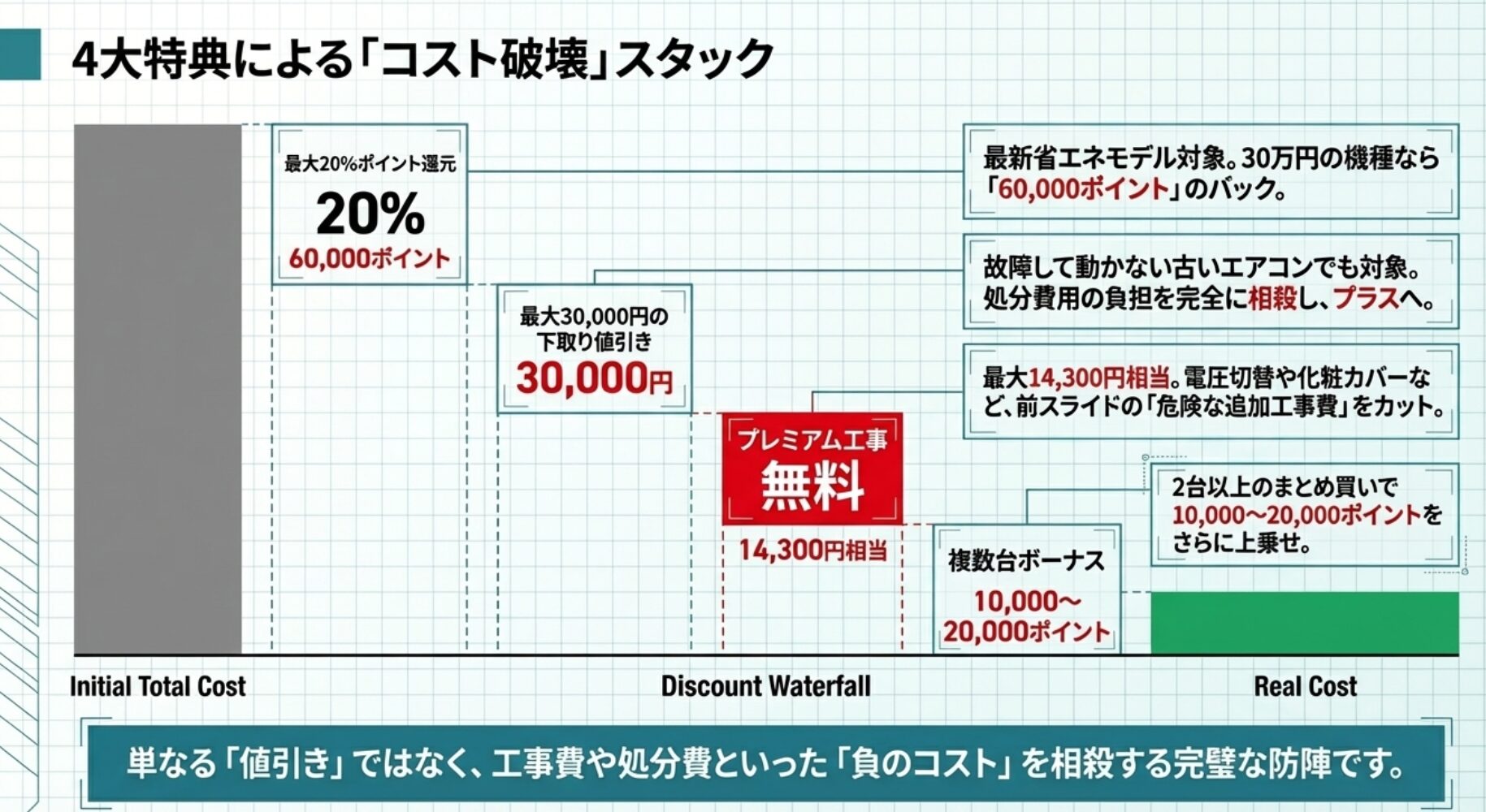 このキャンペーンは夏の繁忙期を避けて早期に購入・設置することで、莫大なポイント還元や値引きを受けられる恒例の大型企画です。