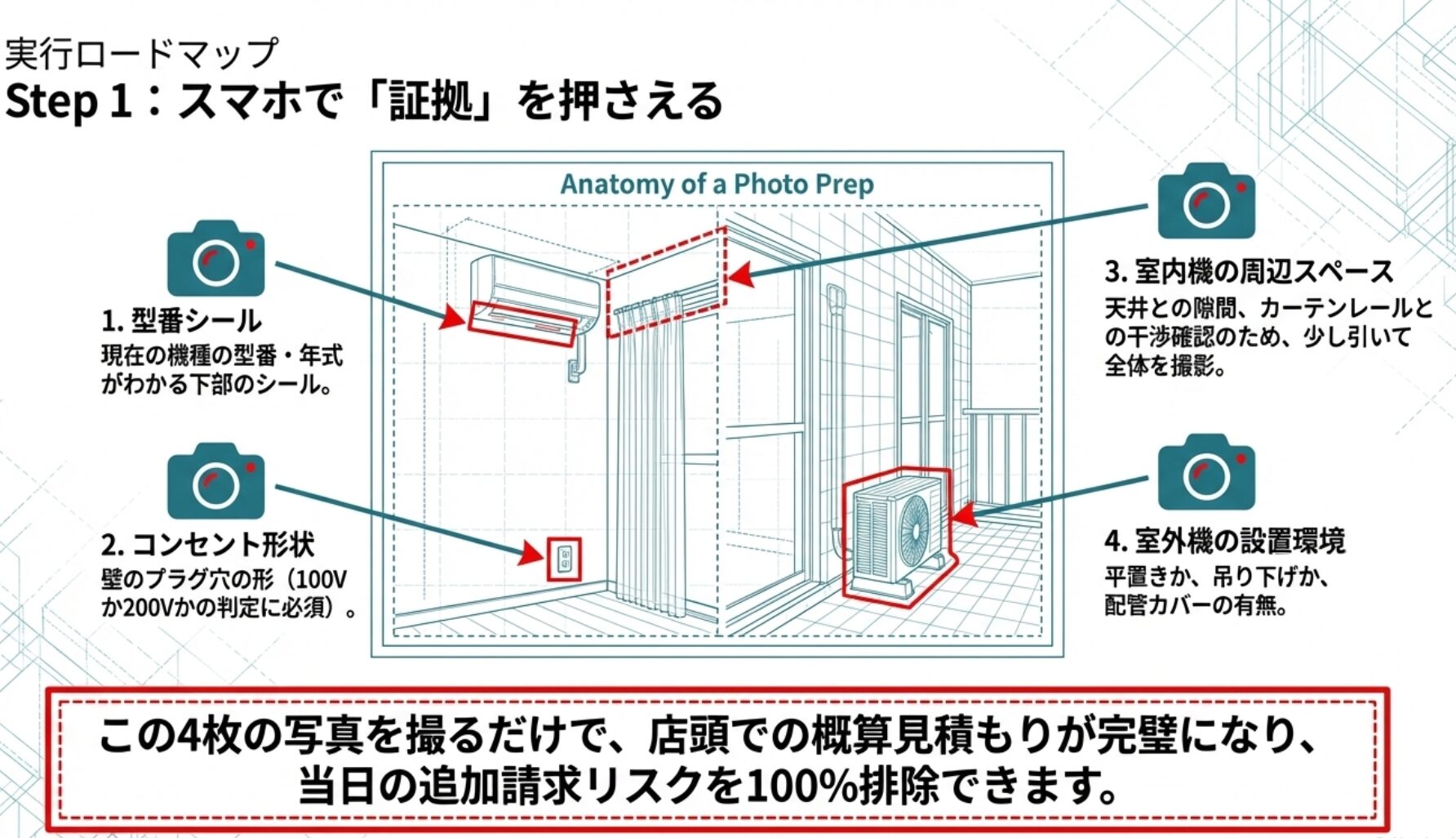 店舗であれば、スマホで撮影した「設置予定場所」「室外機の置き場」「コンセントの形状」を店員さんに見せるだけで、その場で概算の追加工事費を算出してもらえます。