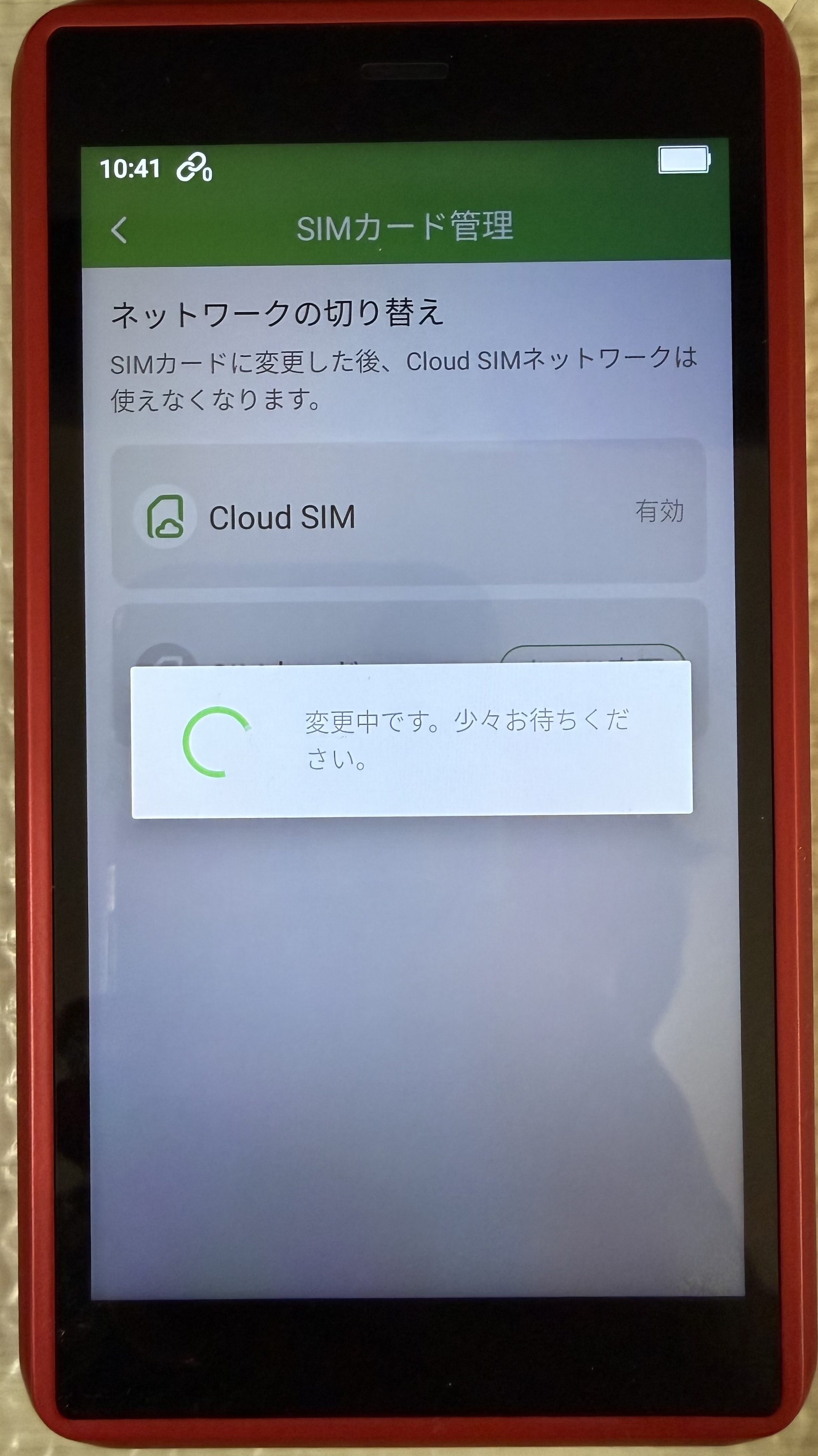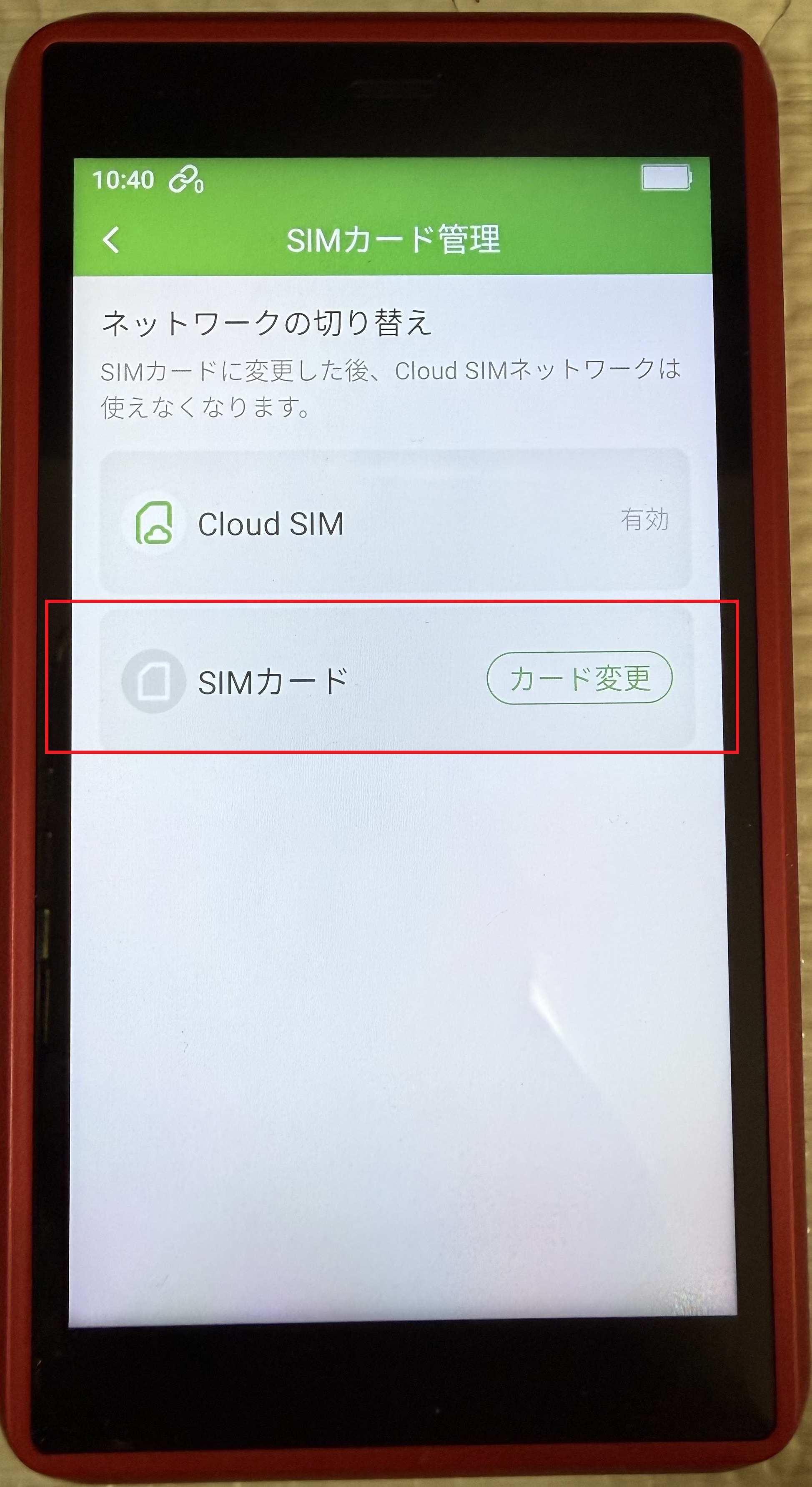 初期設定がクラウドSIMになっているため、物理SIMから接続できるように設定変更します。
