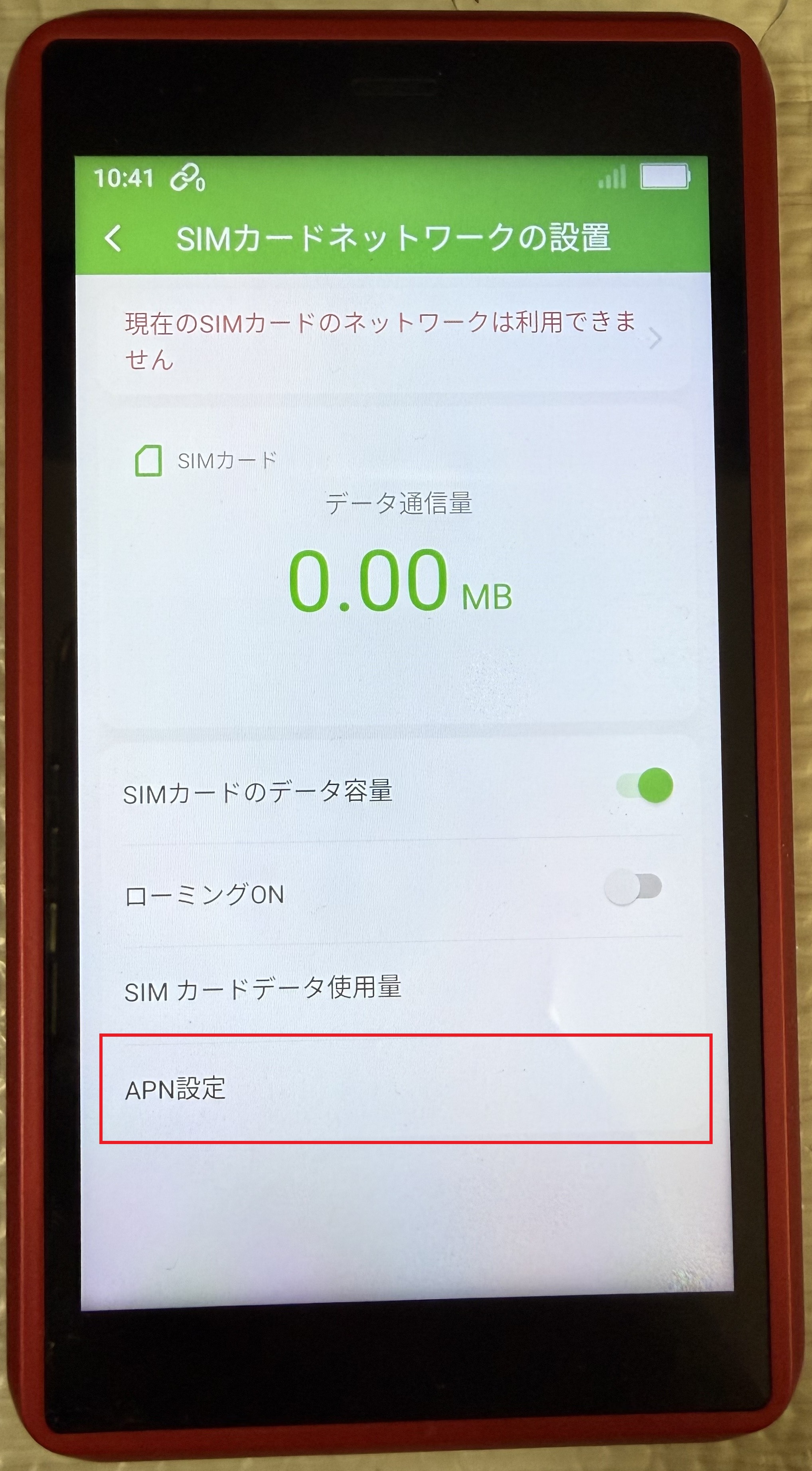 ネットワークが使えないですと表示されます。もう一度、SIMカードをタップします。