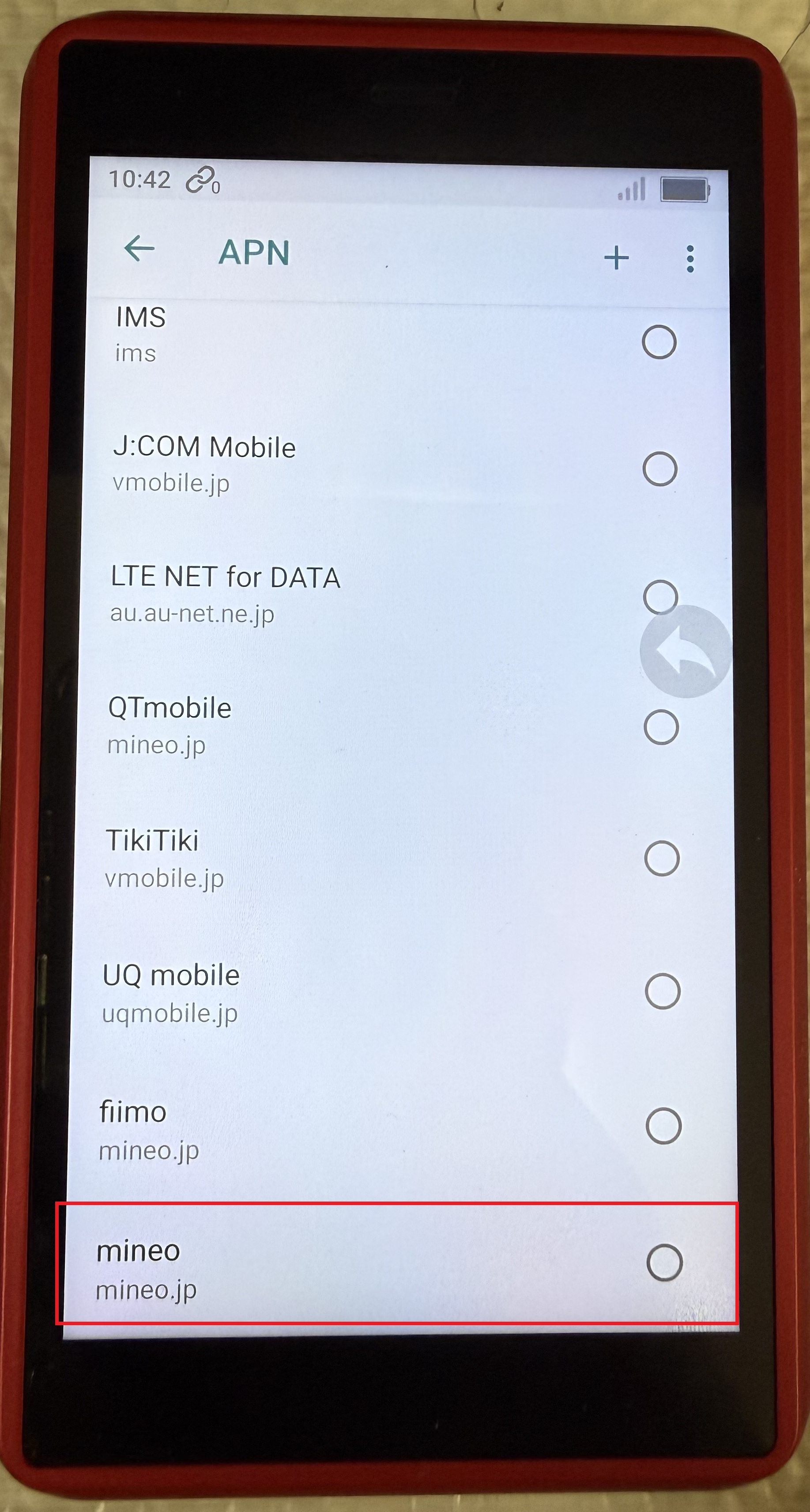 〇の部分を長押ししてmineoを選択します。