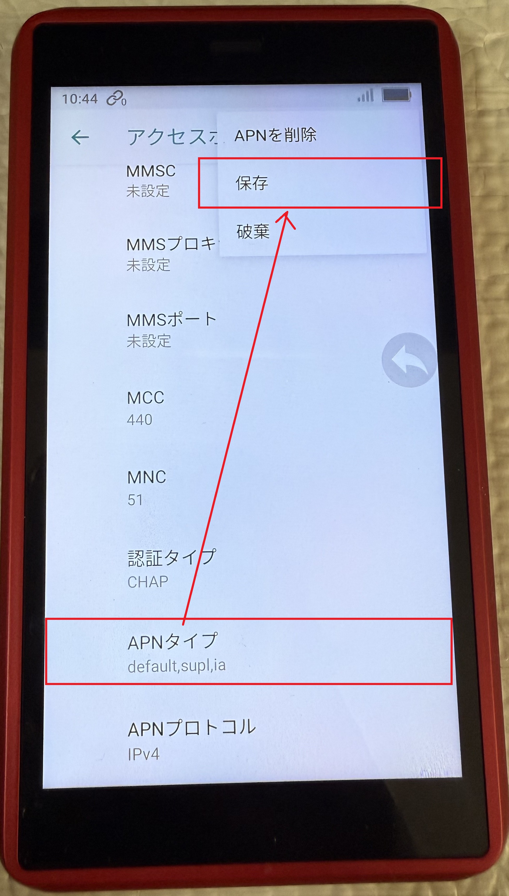 ほとんど設定が入っているます。一か所だけ、APNタイプをタップし、「supl,ia」を追加します。