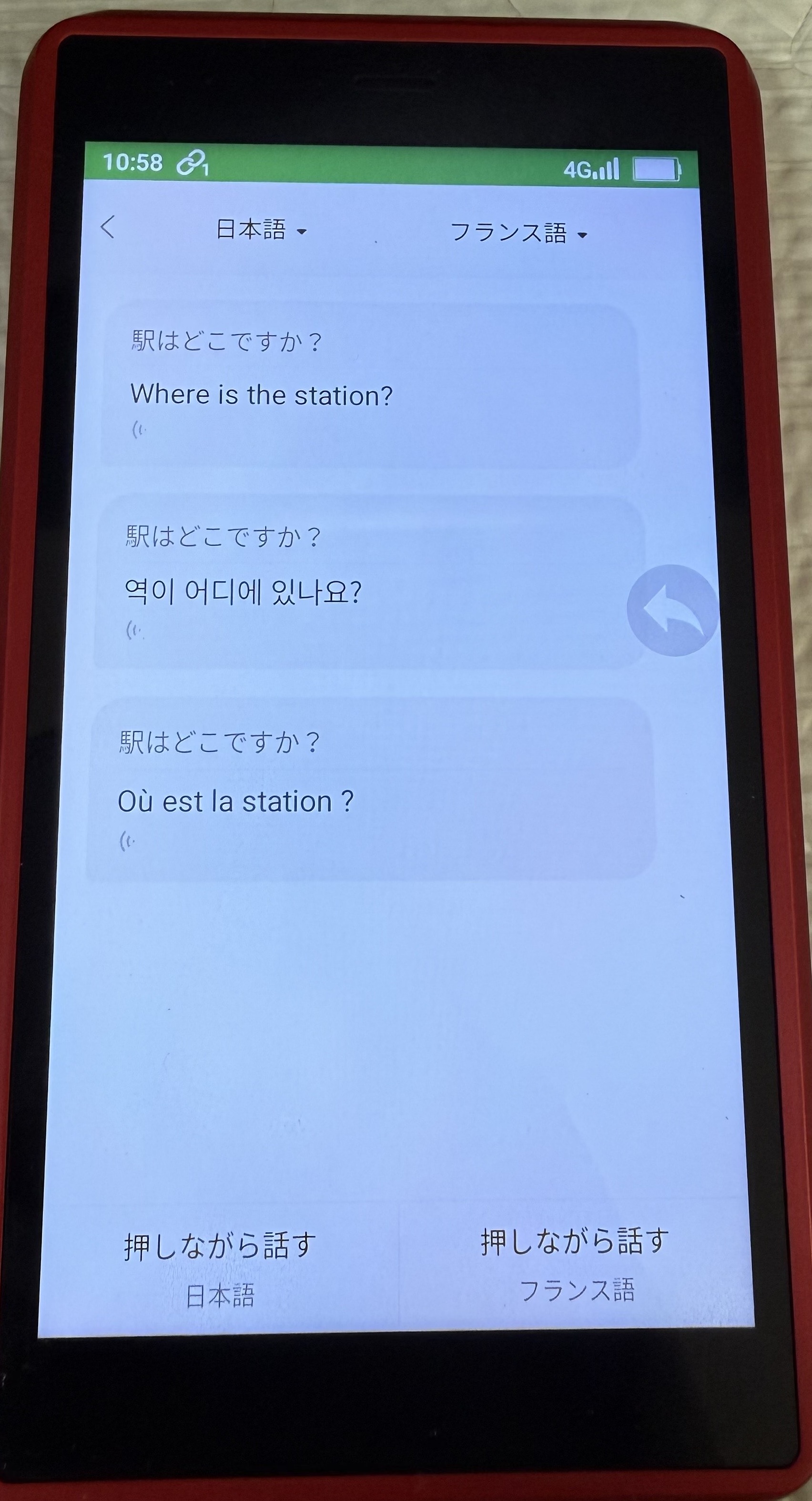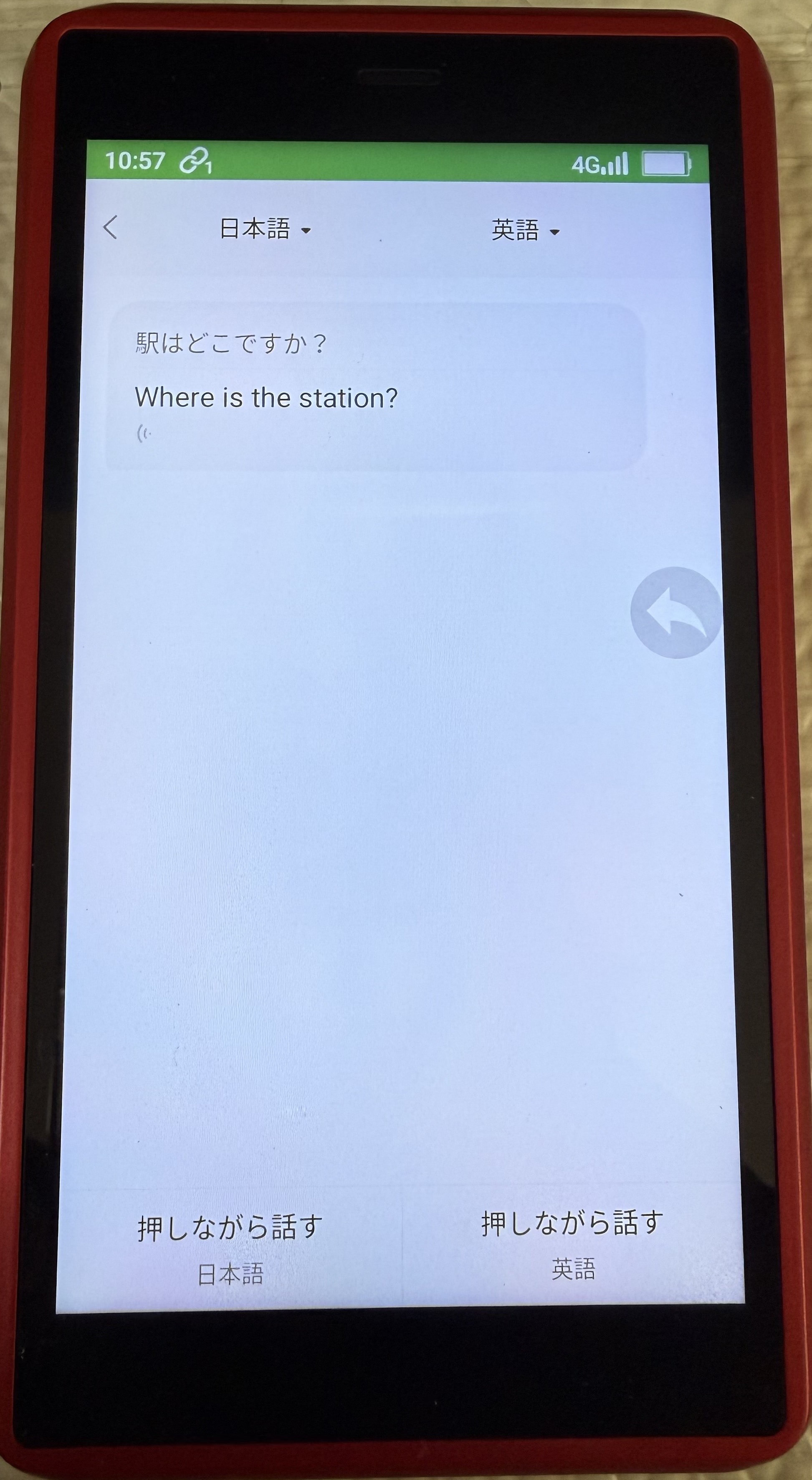 今回、駅はどこですか?と質問したのですが、英訳が音声で流れると同時に、画面にも英語が表示されました。