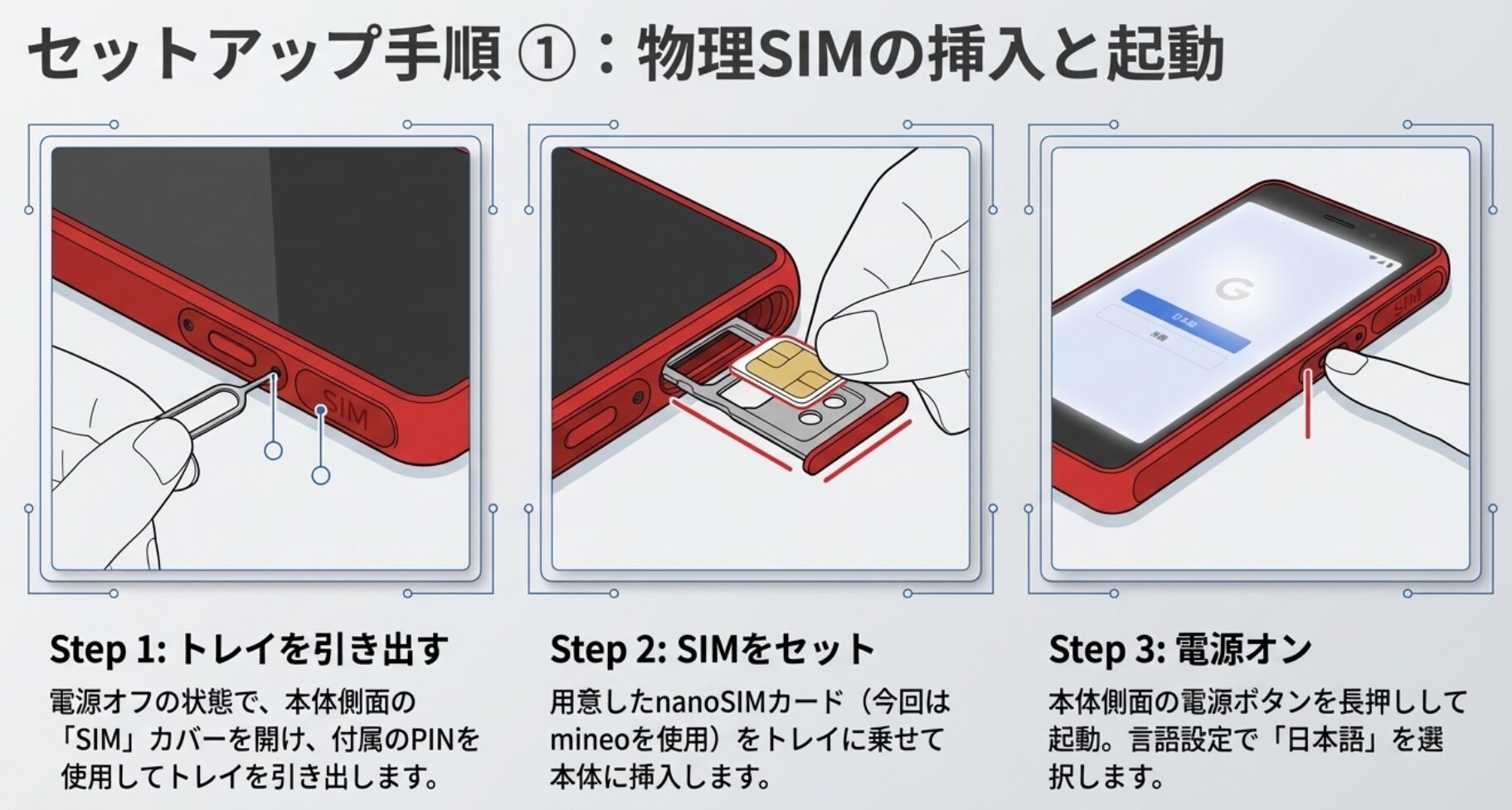 ではさっそくAIR-tra1の設定を行っていきます。電源をオフにした状態で、SIMカードスロットをPINで開けてnanoSIMを挿入します。