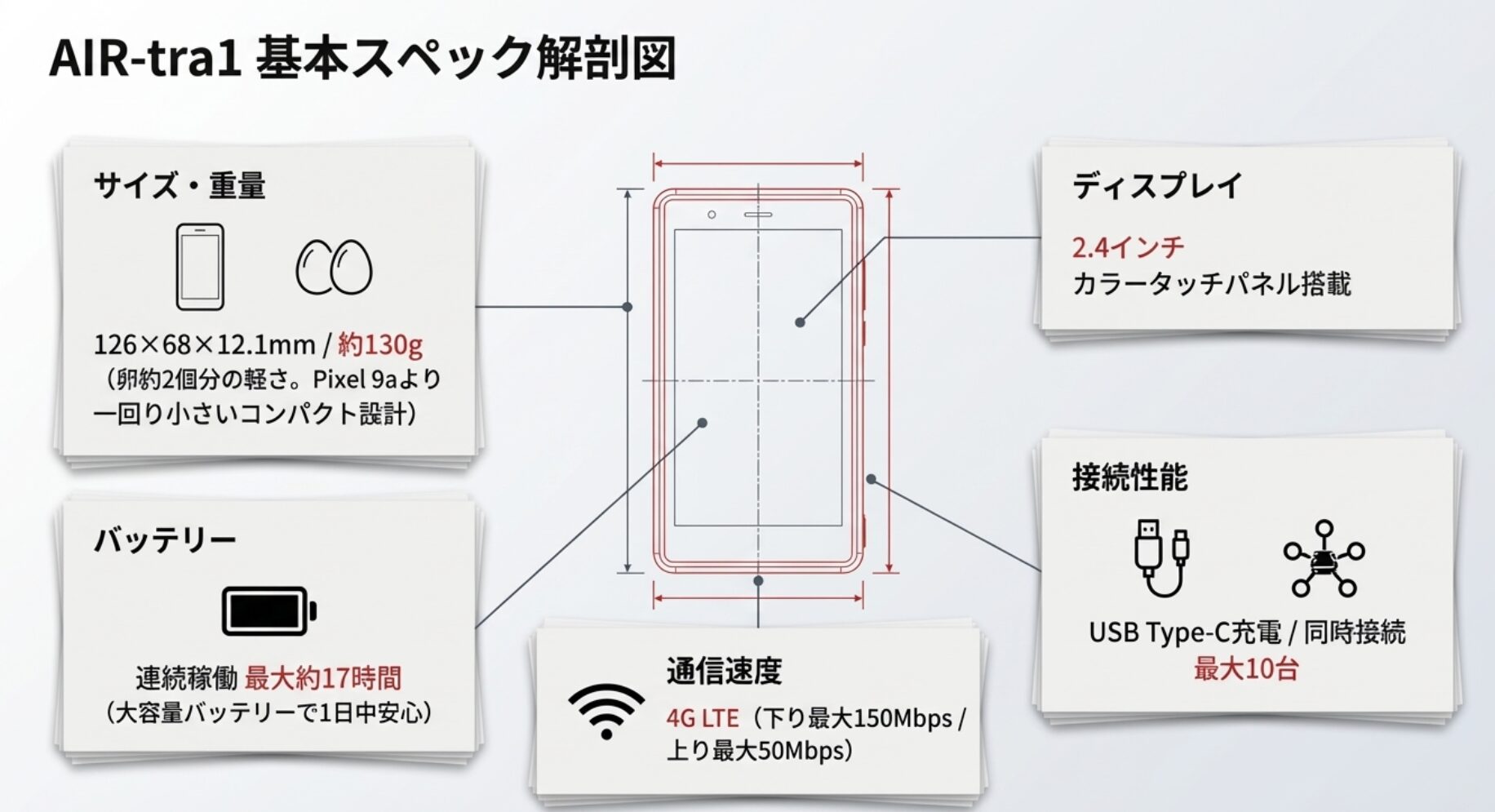 | 通信規格 | 4G LTE(下り最大150Mbps / 上り最大50Mbps) |