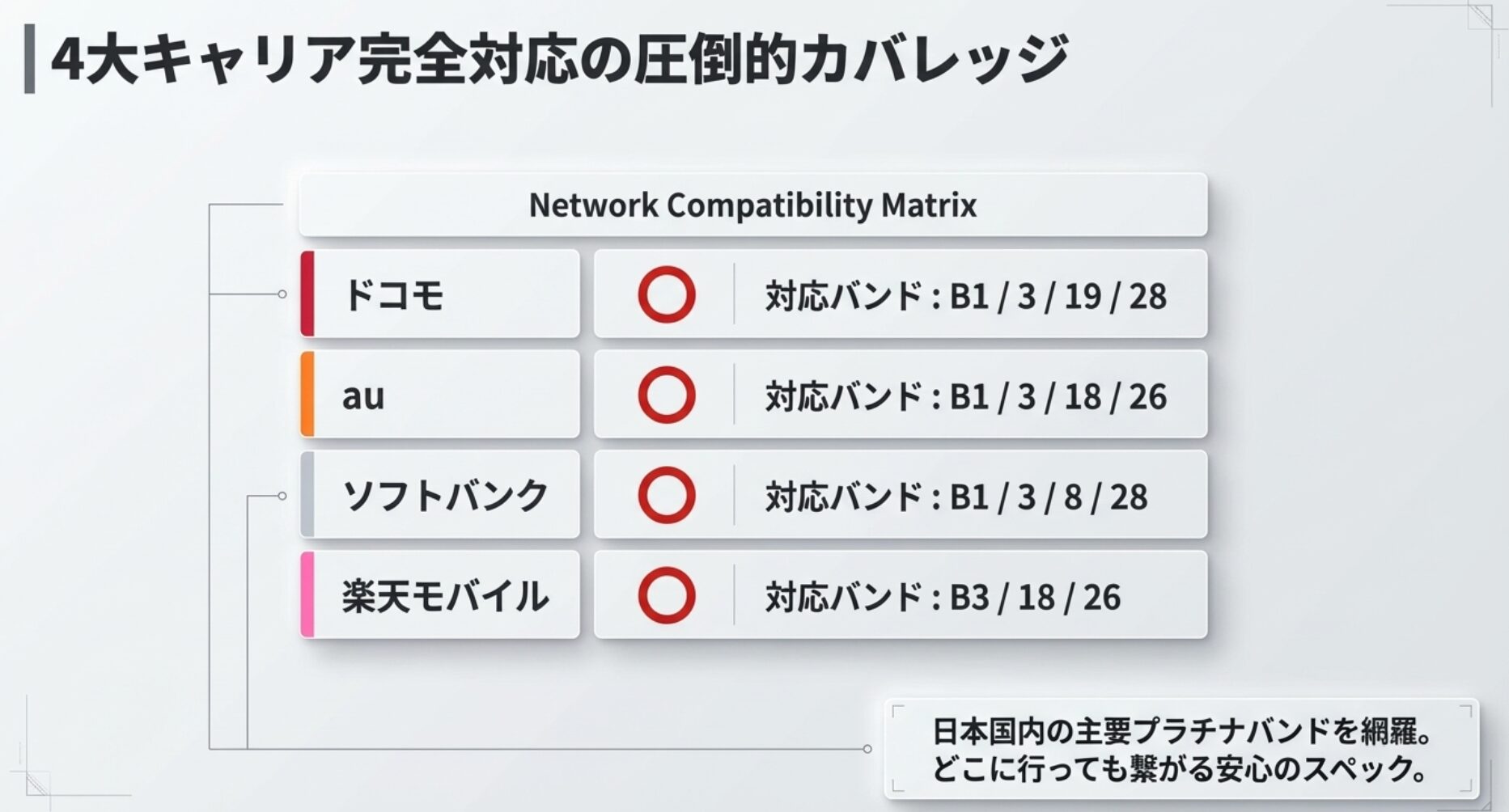 実際にスペックで確認してみると、ドコモ、au、ソフトバンク、楽天モバイルなど幅広いバンドに対応しています。