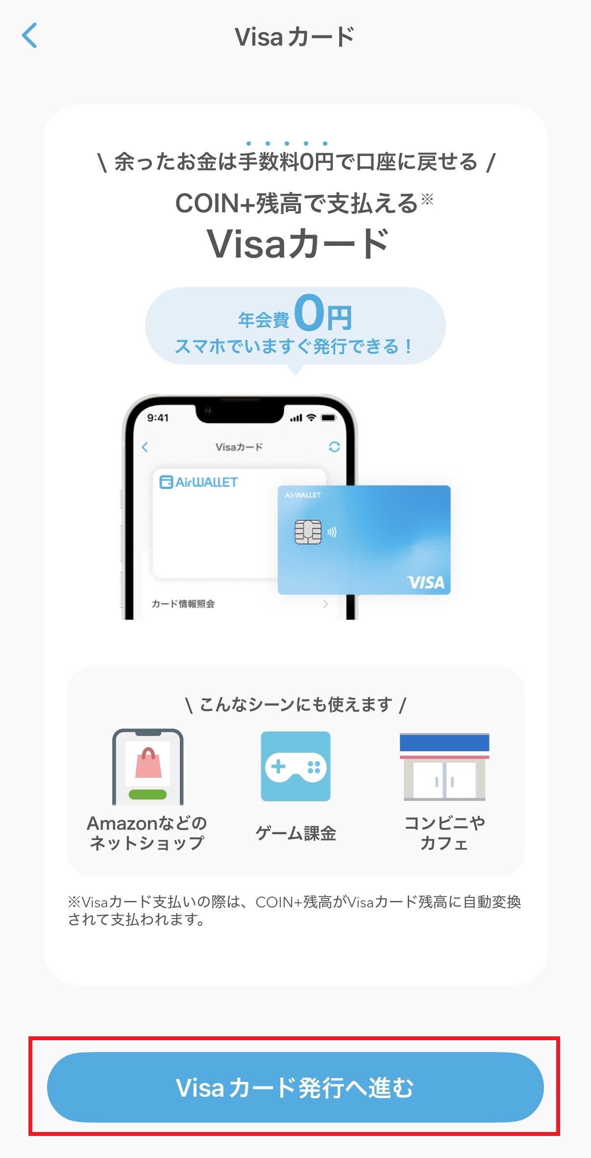 ステップ1:アプリのアップデートとVisaカード発行