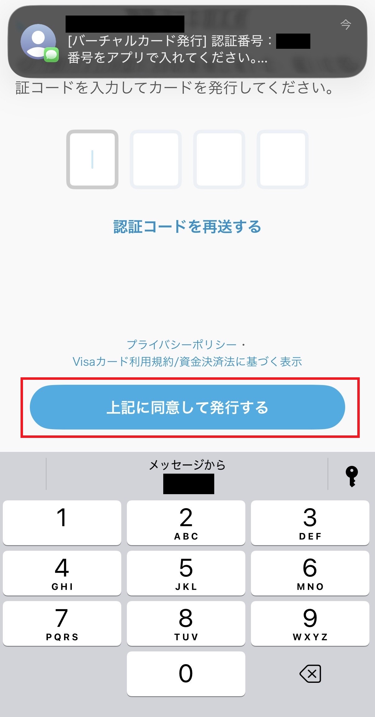 SMS認証が走りますので認証コードを入力します。