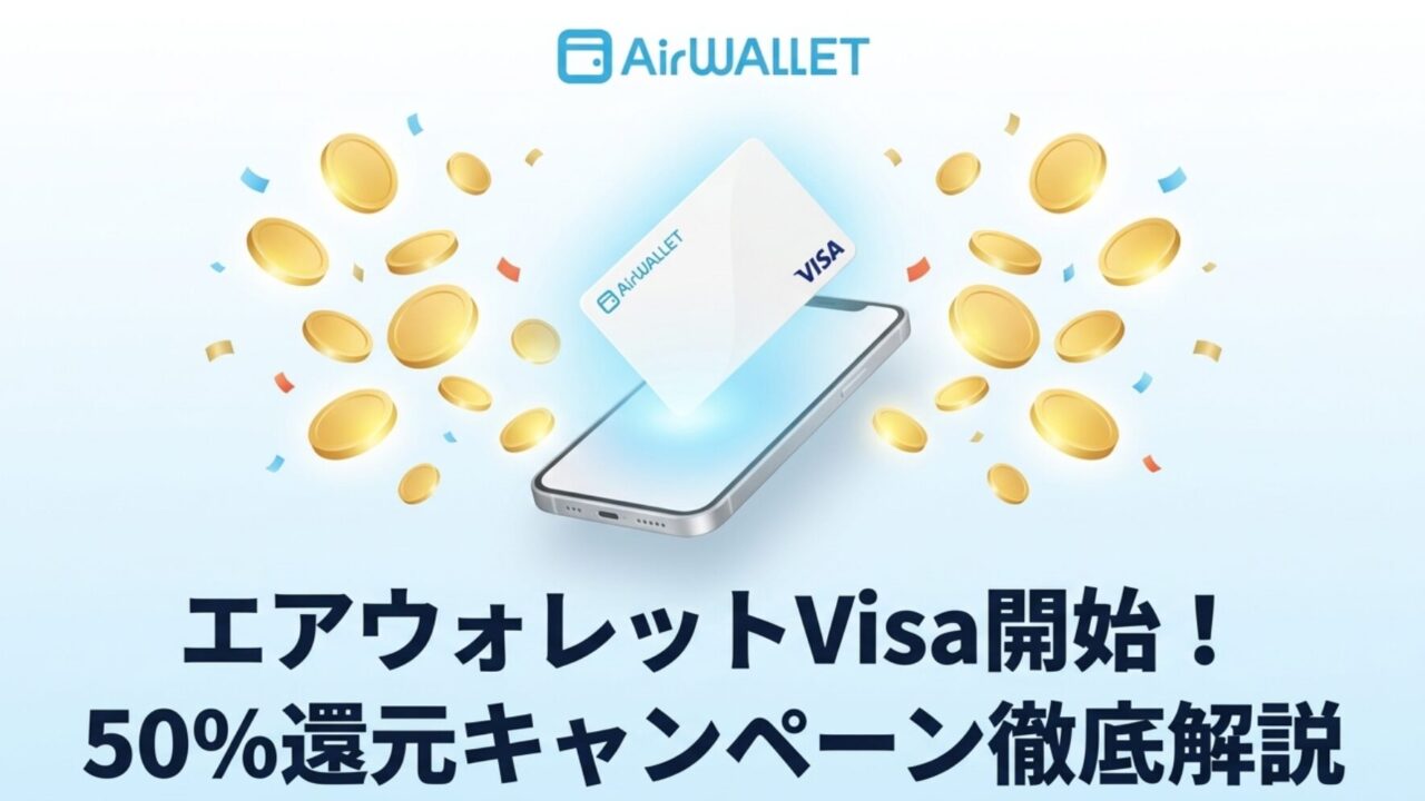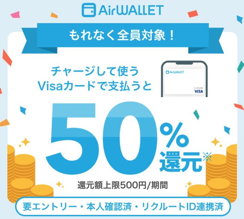 「エアウォレット(AirWALLET)」がついにVisa決済に対応!これを記念して、驚異の「50%還元キャンペーン」が開催されています。