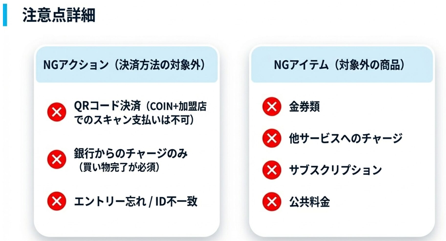 「50%還元だと思って買い物したのに還元されない!」という事態を防ぐため、以下の項目を確認してください。
