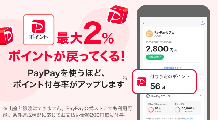 - 還元率: PayPayステップの達成状況に応じて変動。