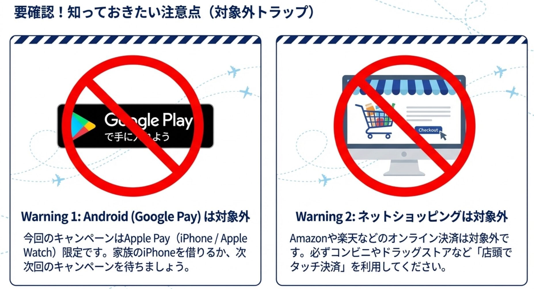 対象外です。Amazonや楽天などのオンライン決済ではなく、必ず「店頭でのタッチ決済」を利用してください。