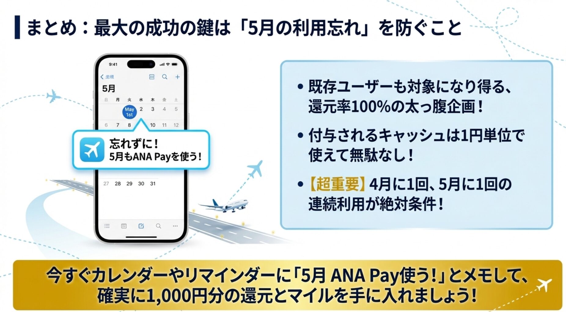 カレンダーやリマインダーに「5月 ANA Pay使う!」とメモしておくことを強くおすすめします。