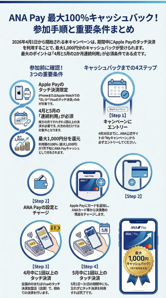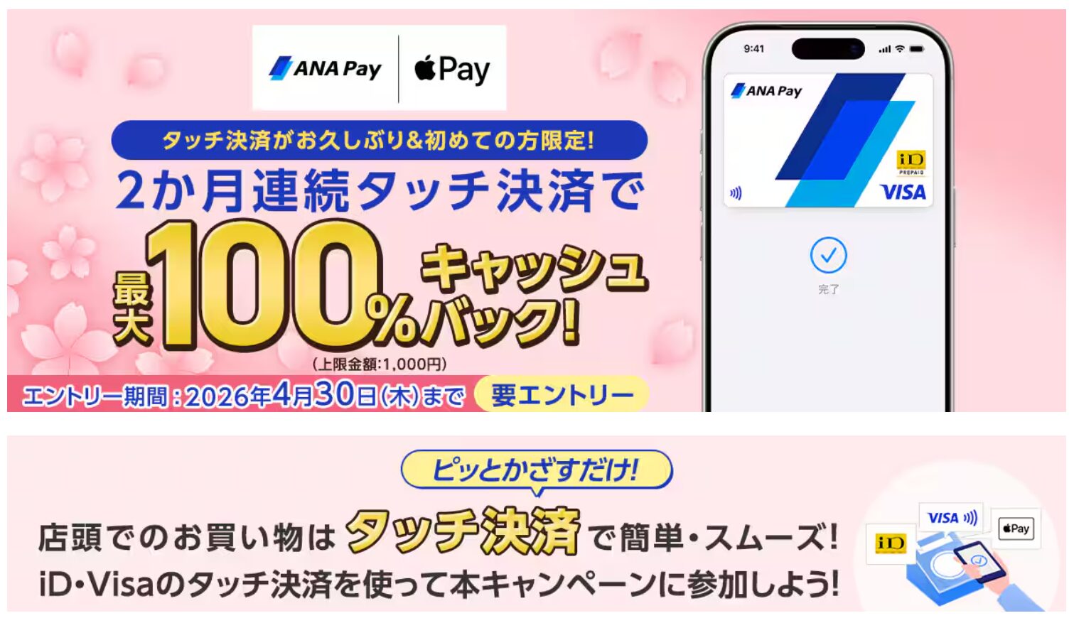 2026年4月1日から開始された今回のキャンペーンは、モバイル決済サービス「ANA Pay」をApple Payのタッチ決済で利用すること。