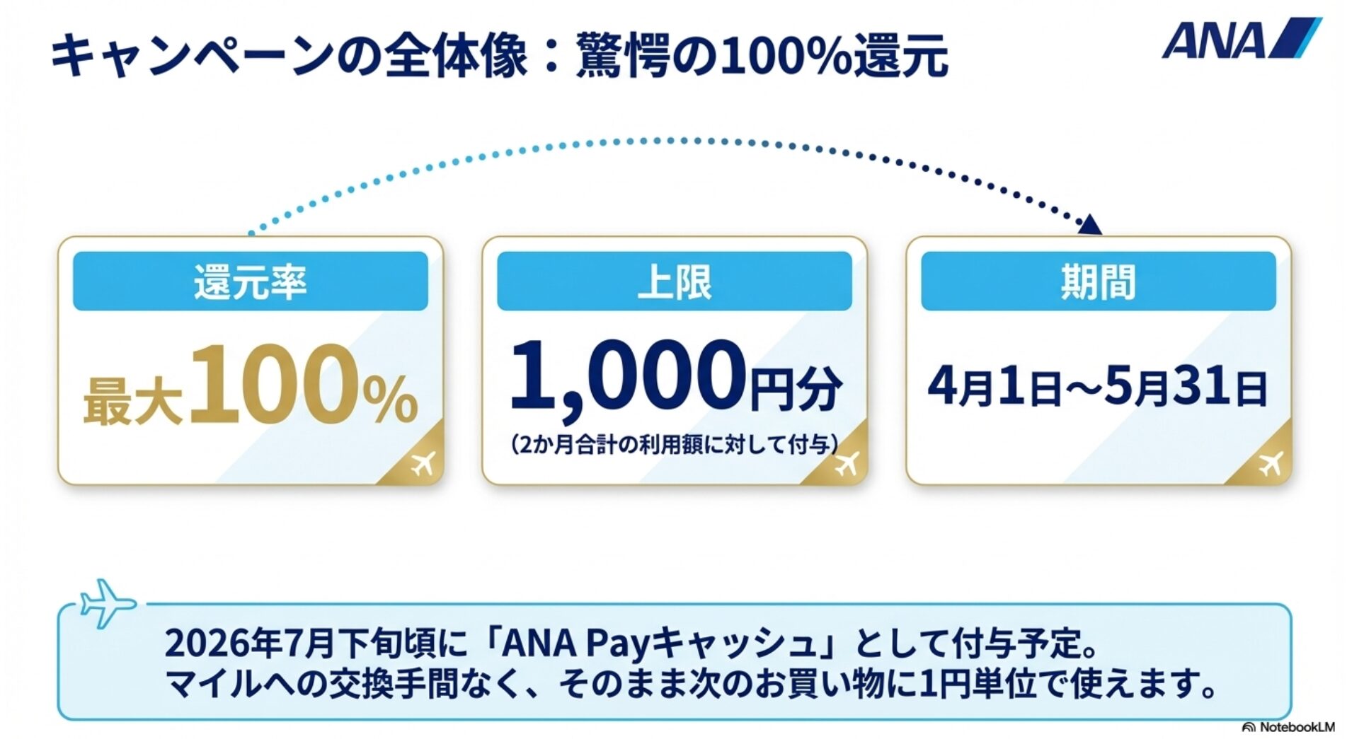 2026年4月からスタートしたANA Payの最大100%キャッシュバックキャンペーンは、既存ユーザーも対象になり得る非常に太っ腹な企画です。