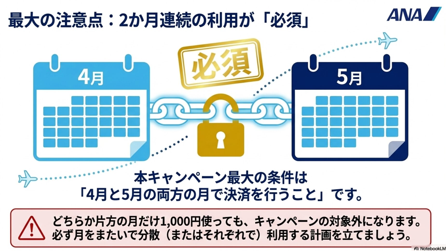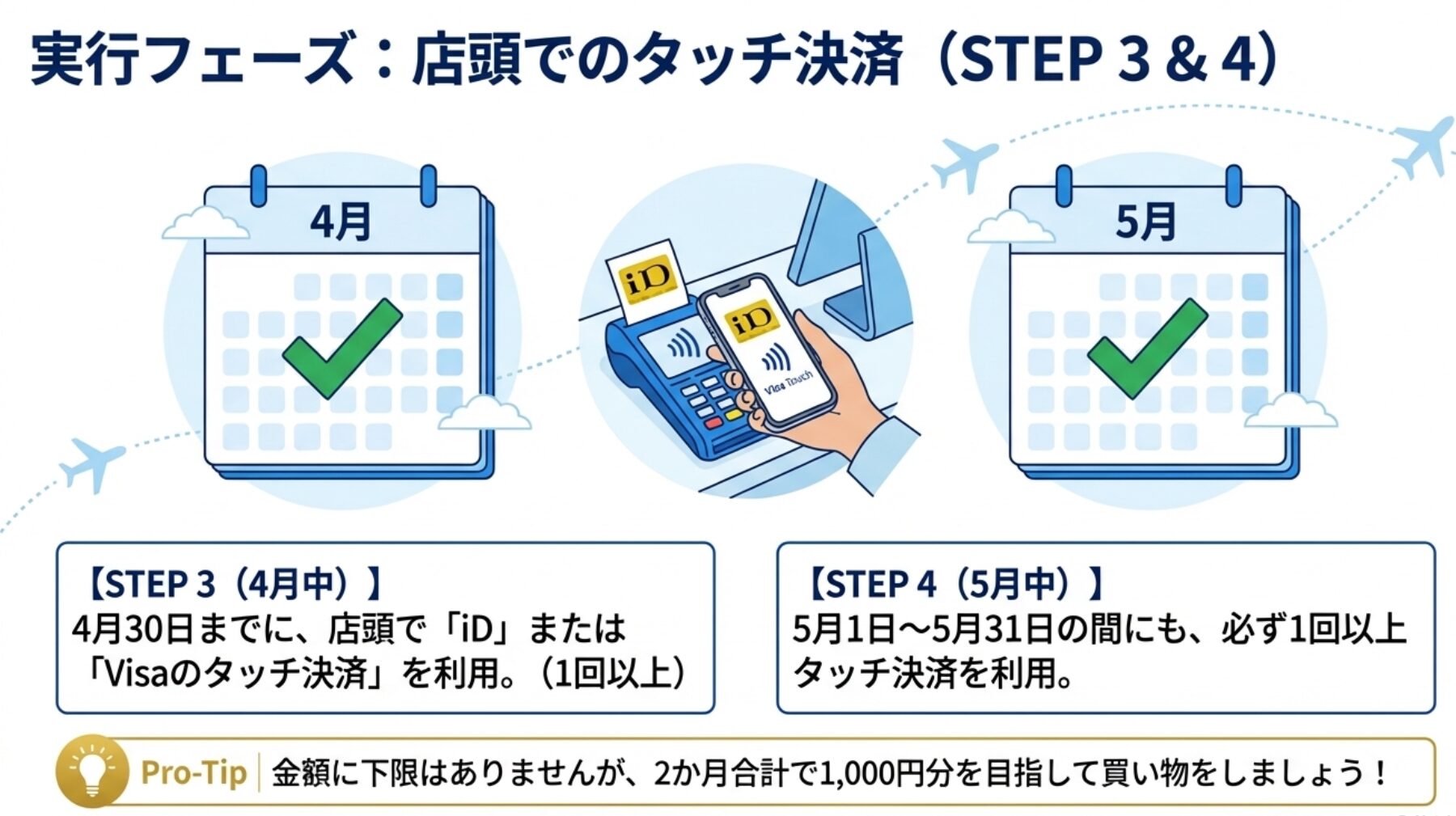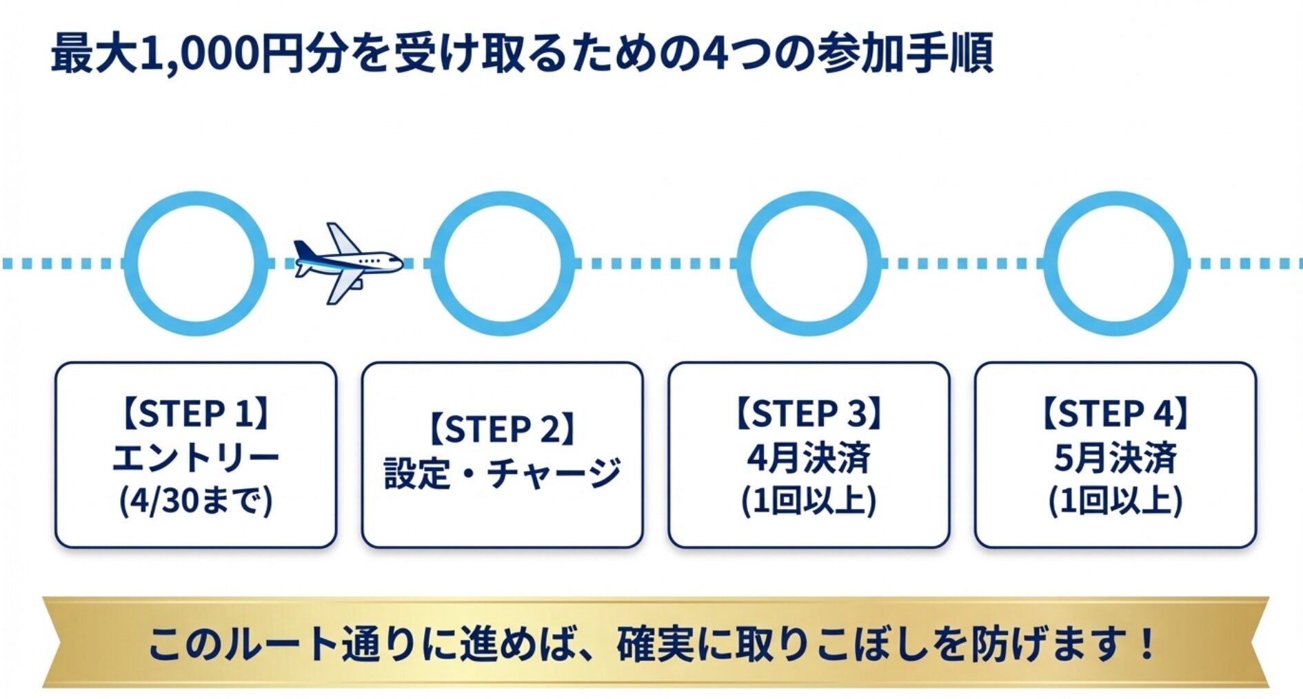 成功の鍵は、「4月中にエントリーと1回目の利用を済ませ、5月に忘れず2回目の利用をすること」に尽きます。
