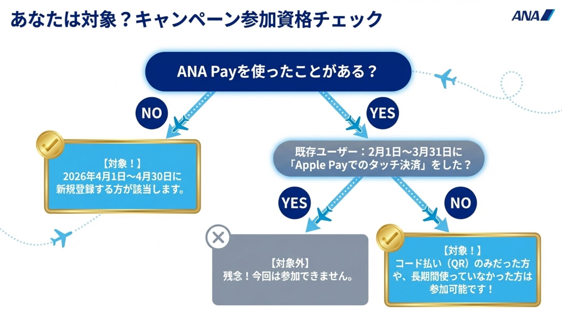 2026年4月1日(水)から2026年4月30日(木)までの間に、初めてANA Payのアカウント登録を完了した方が対象です。