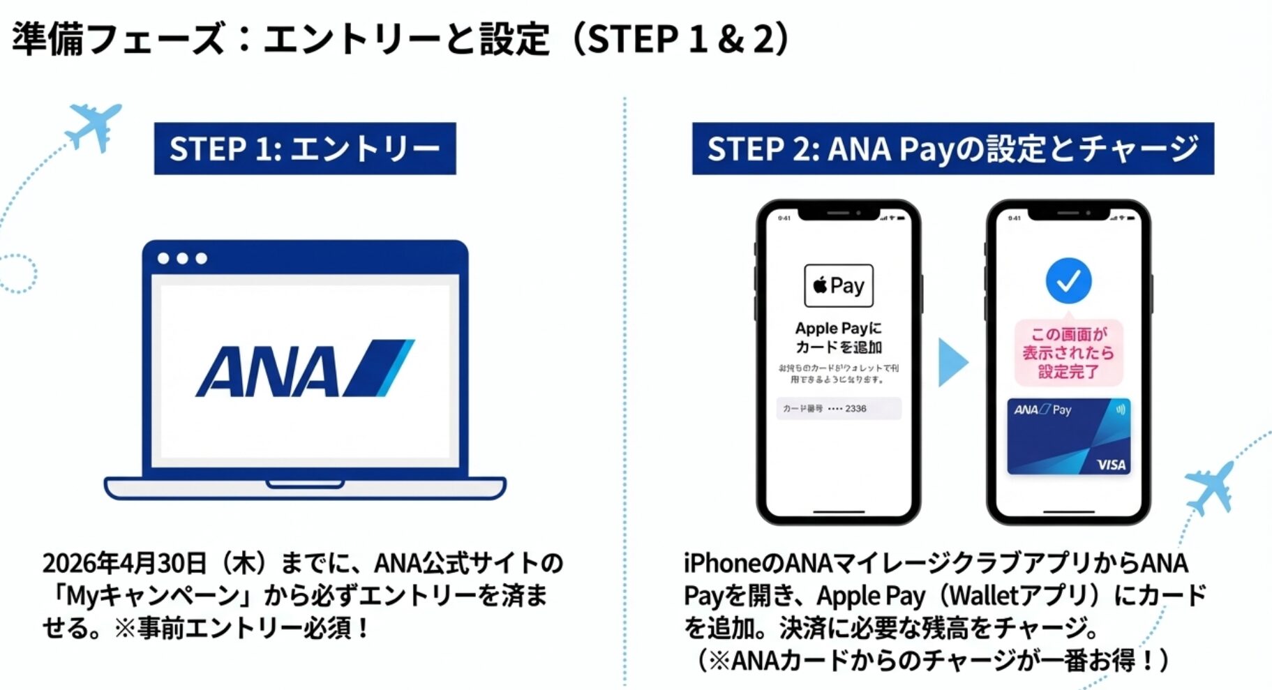 2026年4月30日(木)までに、ANA公式サイトの「Myキャンペーン」から必ずエントリーを済ませてください。