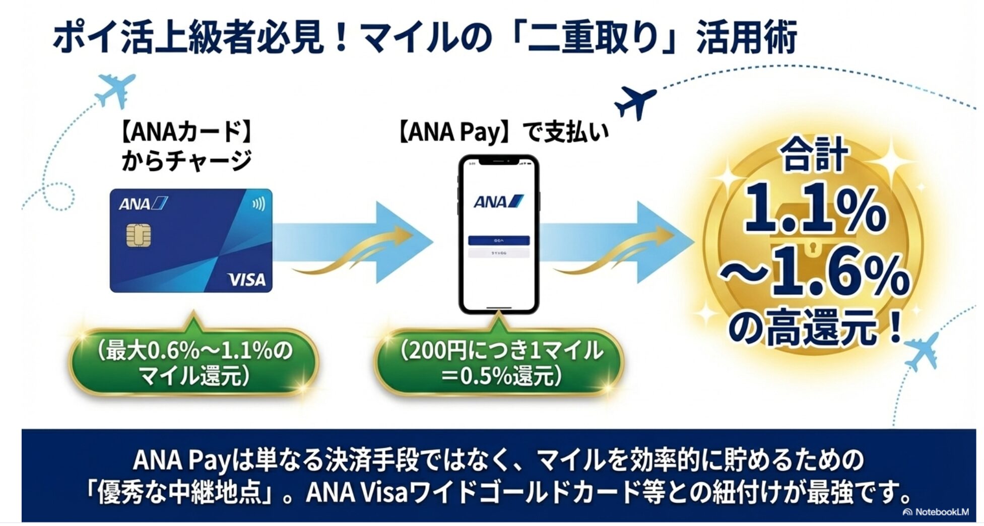 ANA Payを利用する際、ANAカードからチャージを行うことで、以下のようにマイルの二重取りが成立します。