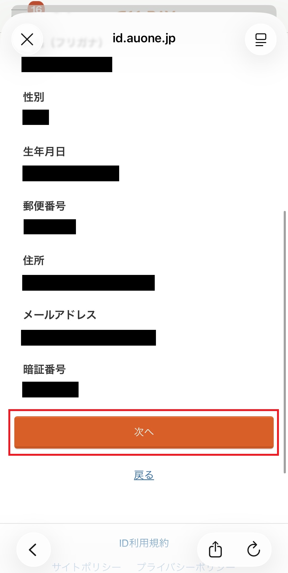 ここまで入力した内容の確認画面が表示されます。問題なければ「次へ」をタップします。