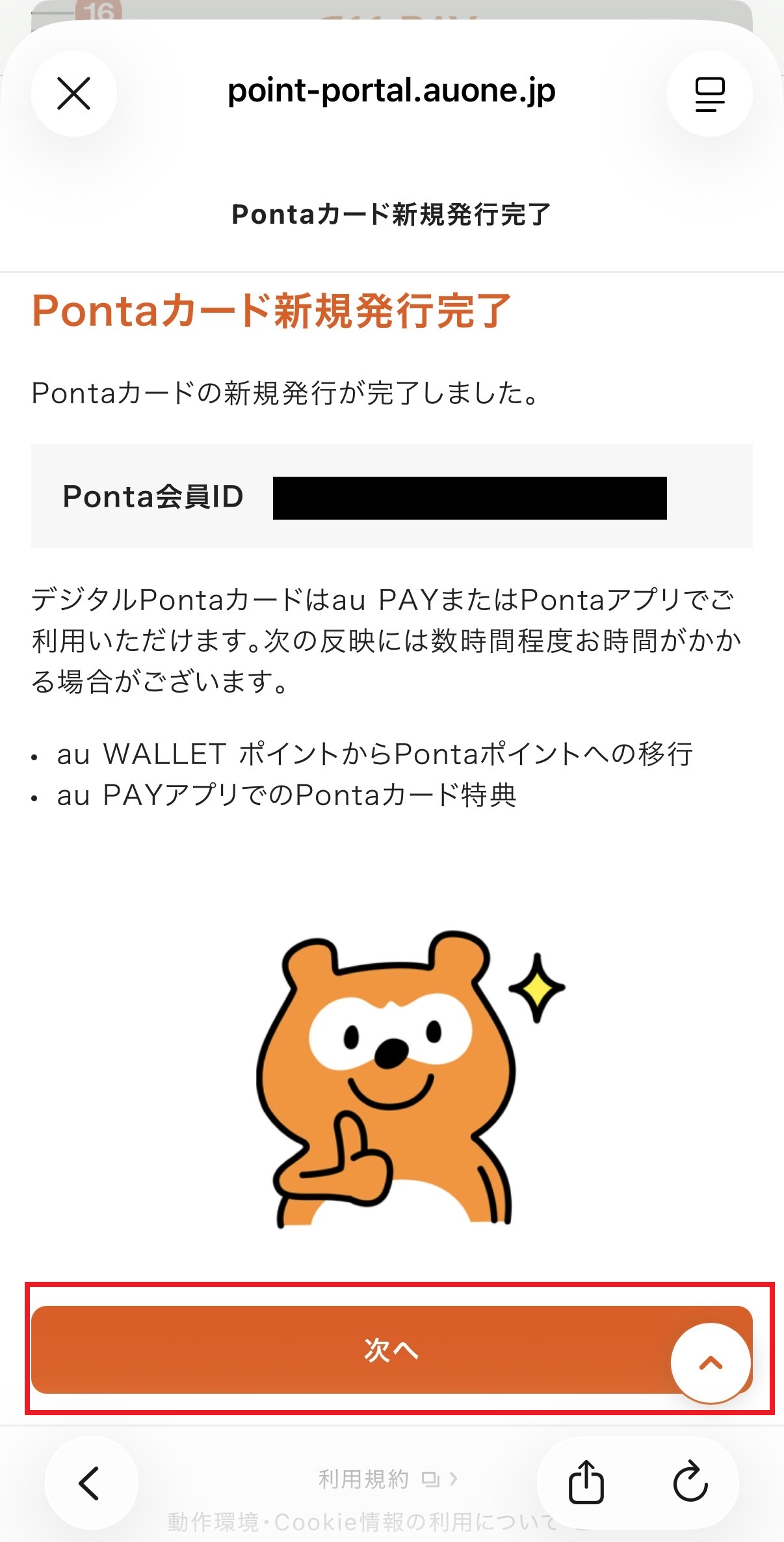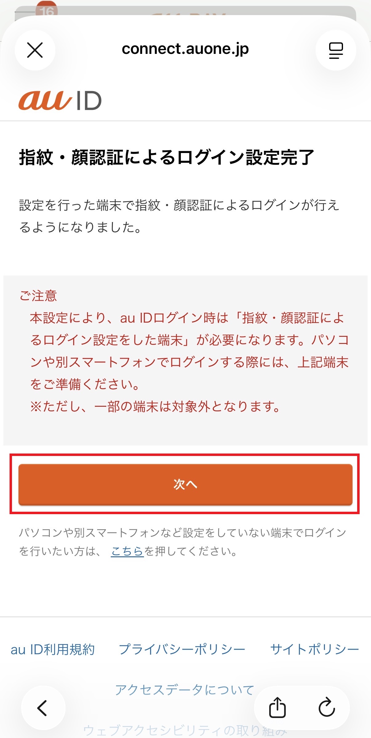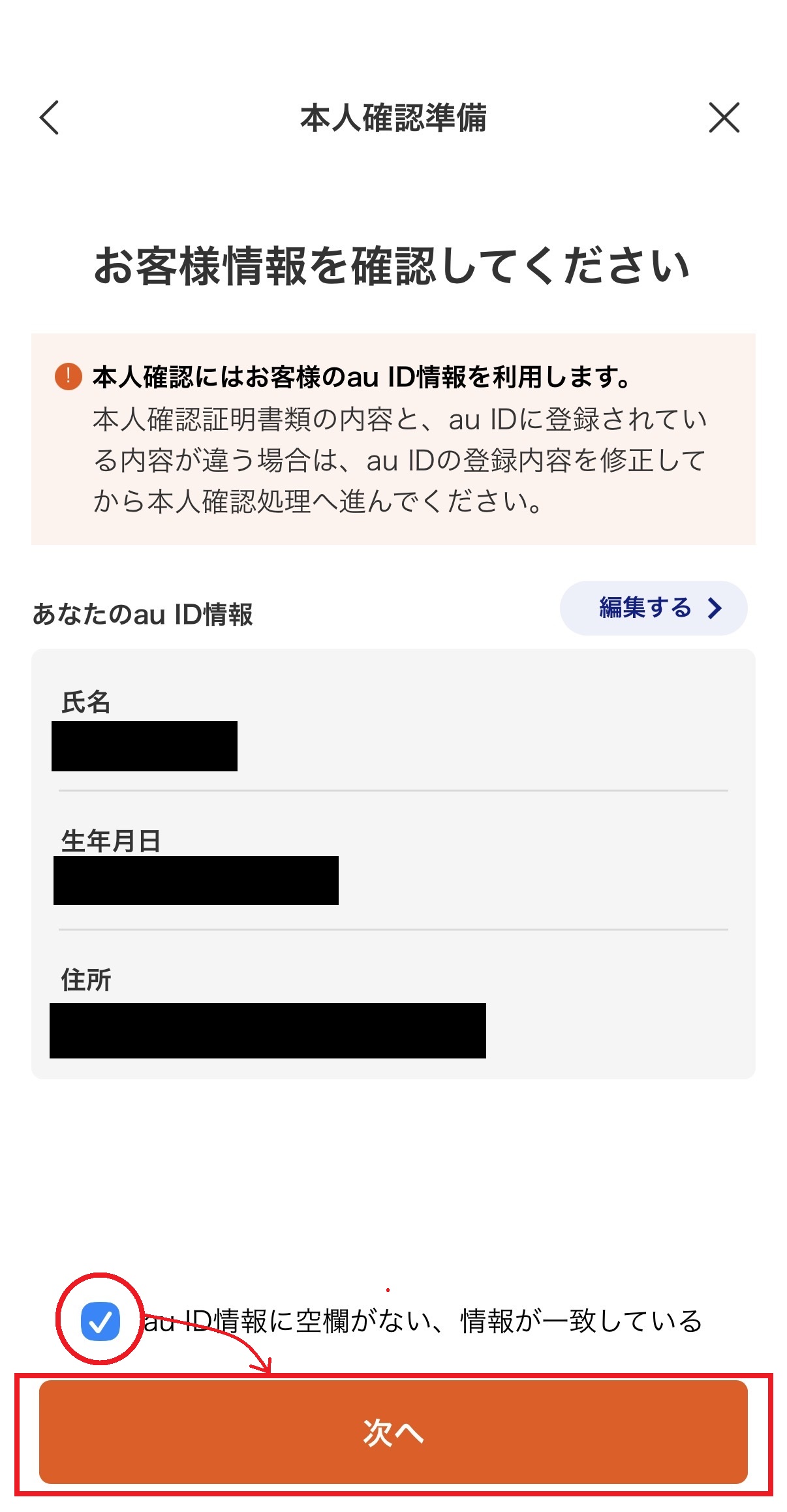 内容を確認して問題なければチェックボックスにチェックを入れて「次へ」をタップします。