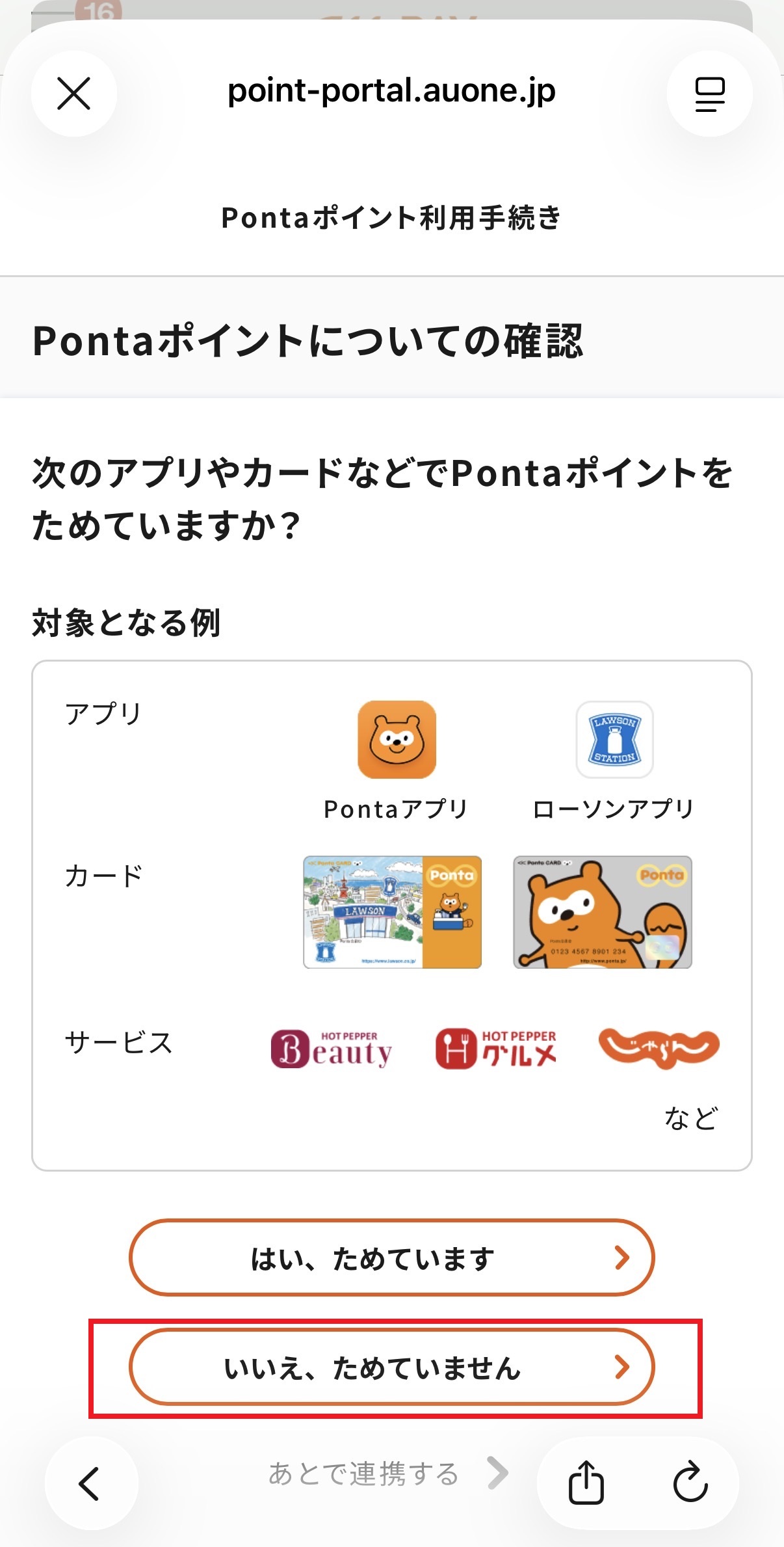 Pontaポイントの画面に自動的に遷移します。ここでは、「いいえ貯めていません」をタップします。