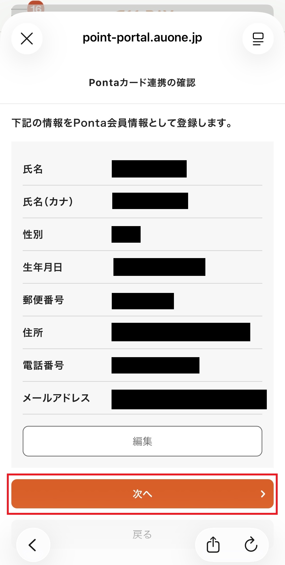 確認画面が表示されますので間違いなければ「次へ」をタップします。