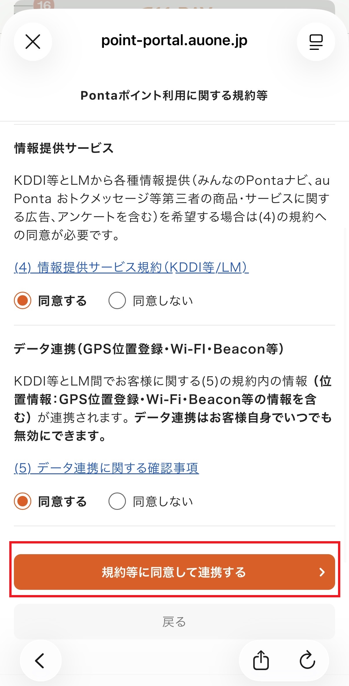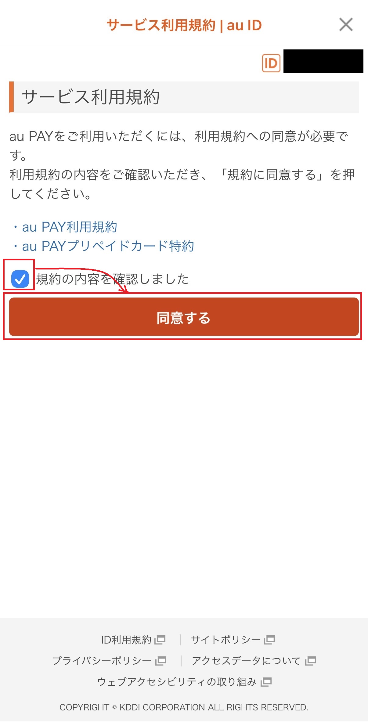 サービス利用規約画面に自動的に遷移しますので、規約内容確認にチェックを入れて「同意する」をタップします。
