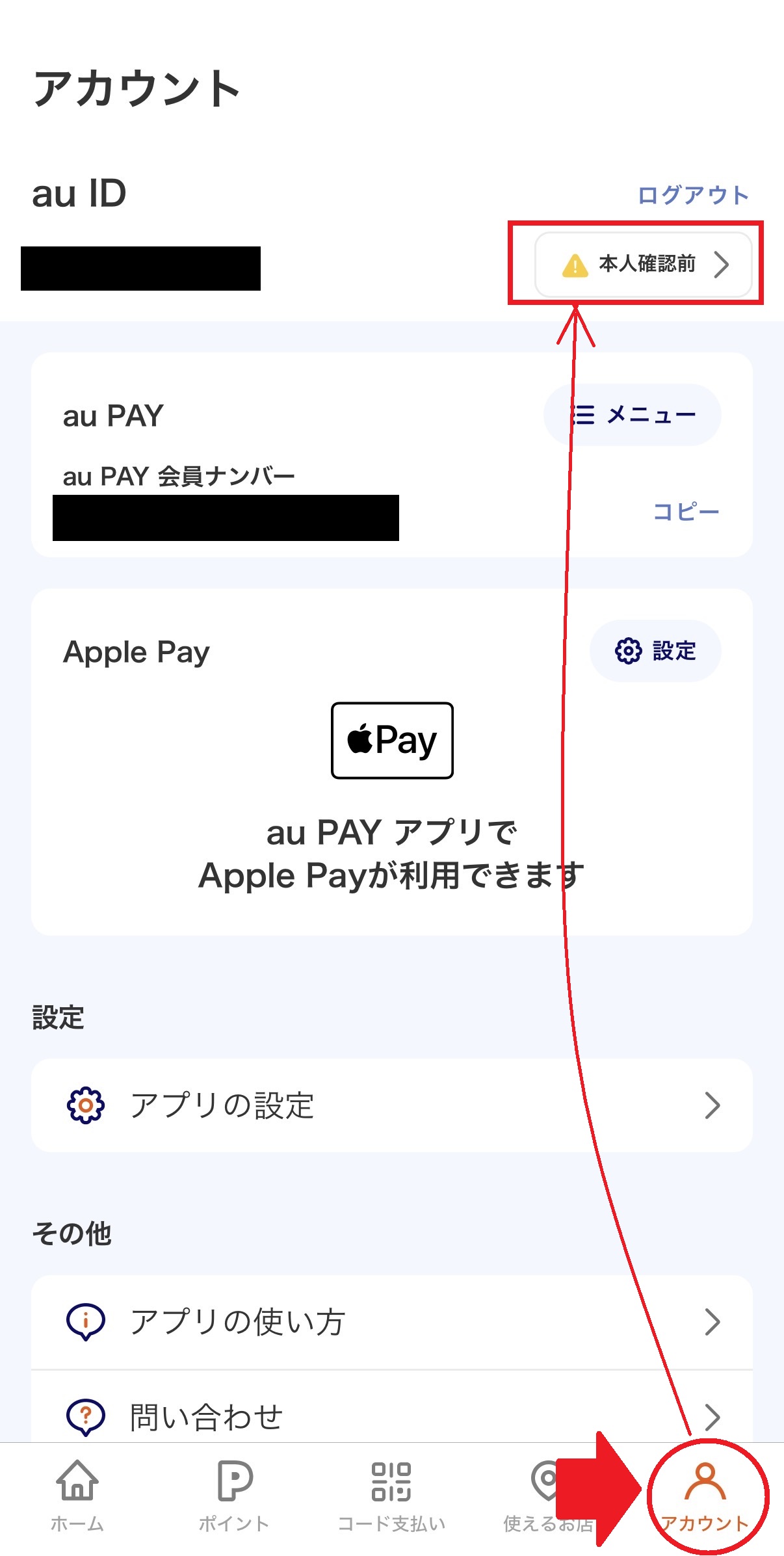 au PAY の最下部、アカウントをタップし、「本人確認前」をタップします。