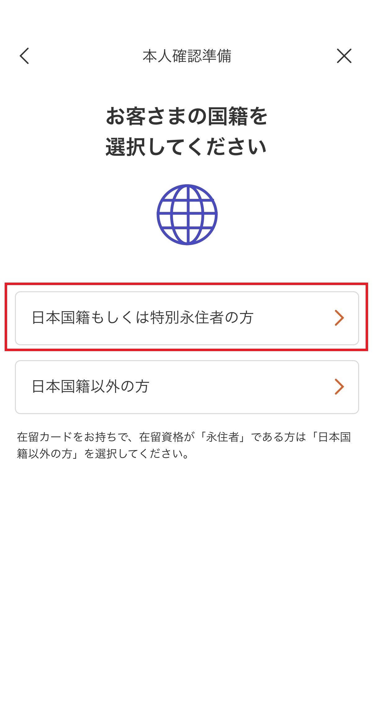 国籍を選択します。ここでは日本国籍もしくは特別永住者の方を選択します。