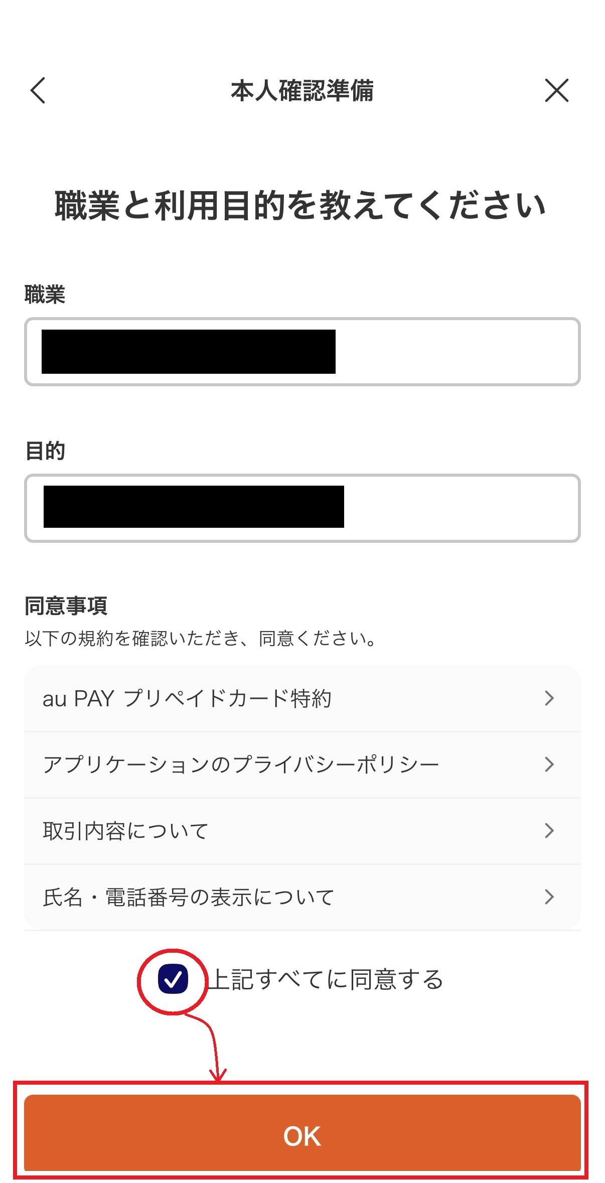 職業と目的を入力して、同意するにチェックして「OK」をタップします。