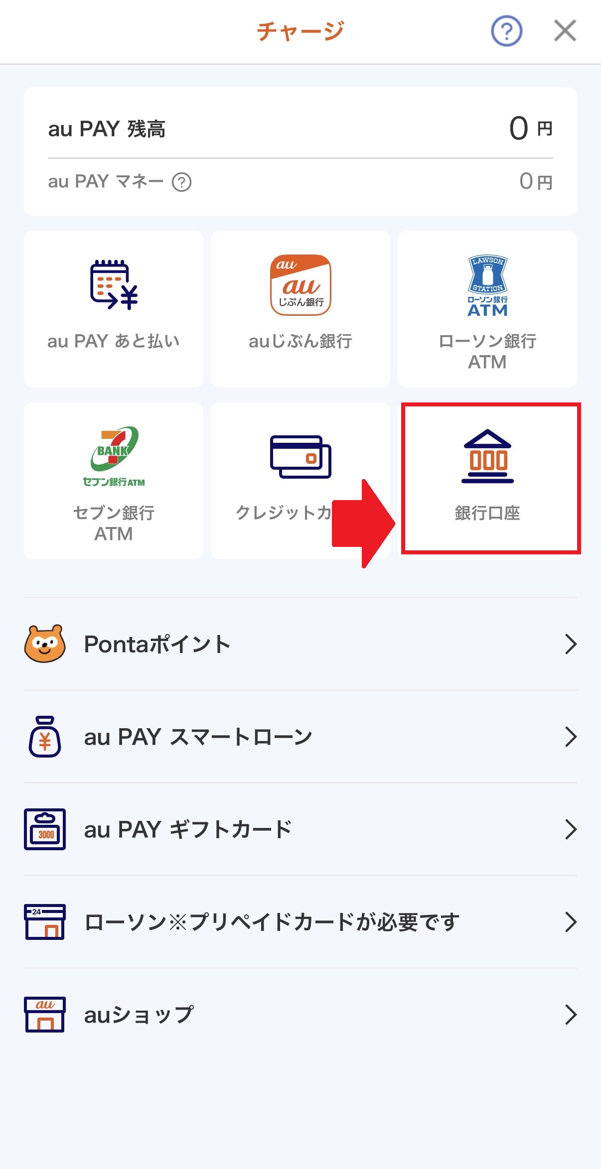 銀行口座やATMからau PAYに入金する方法。今回のキャンペーンの対象の決済方法です。