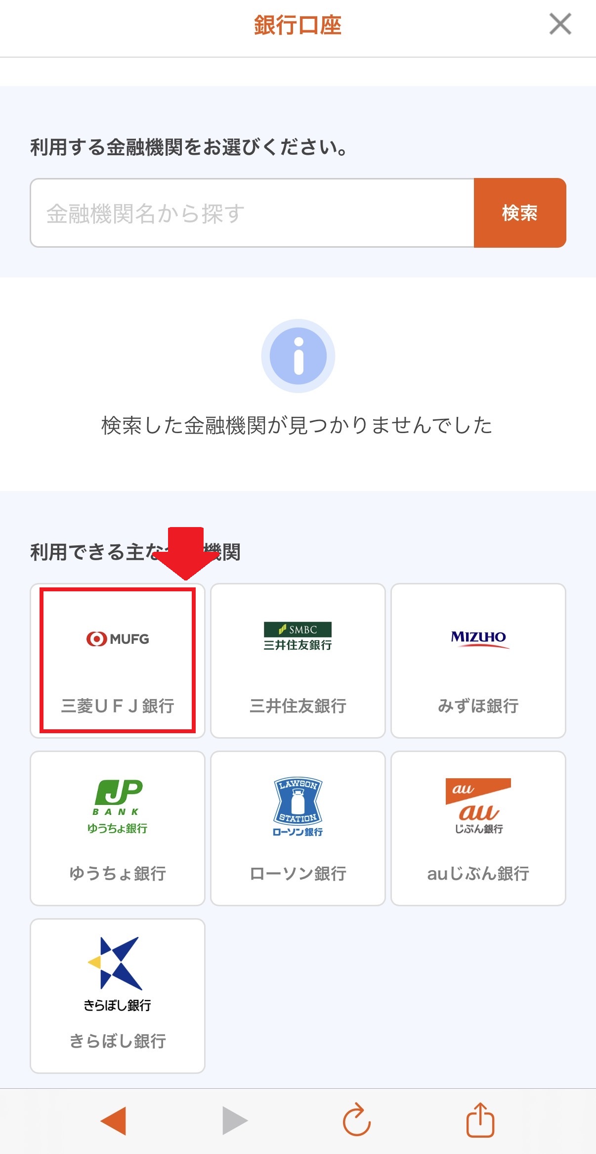 銀行名を検索します。ここでは三菱UFJ銀行で試してみます。