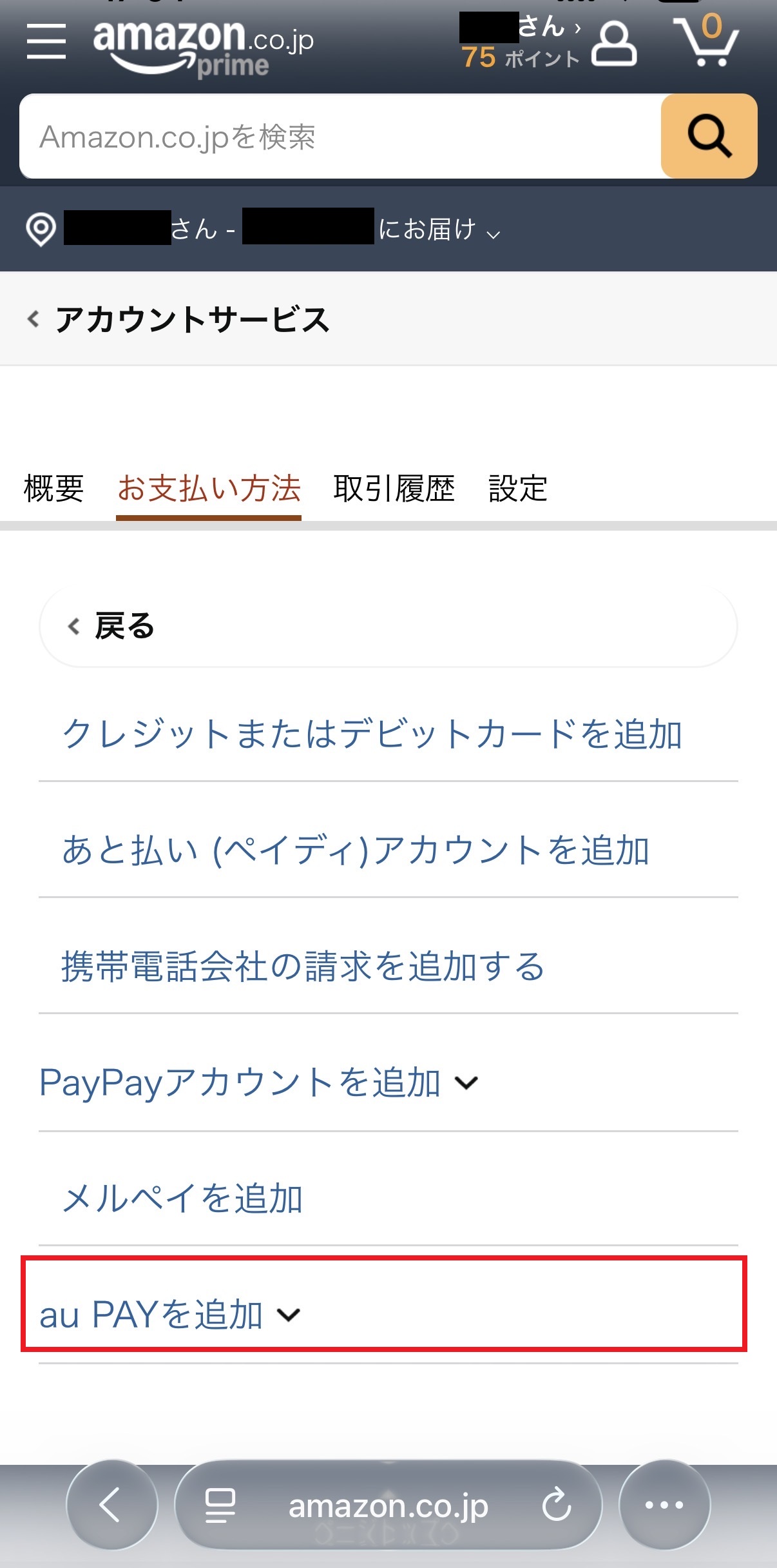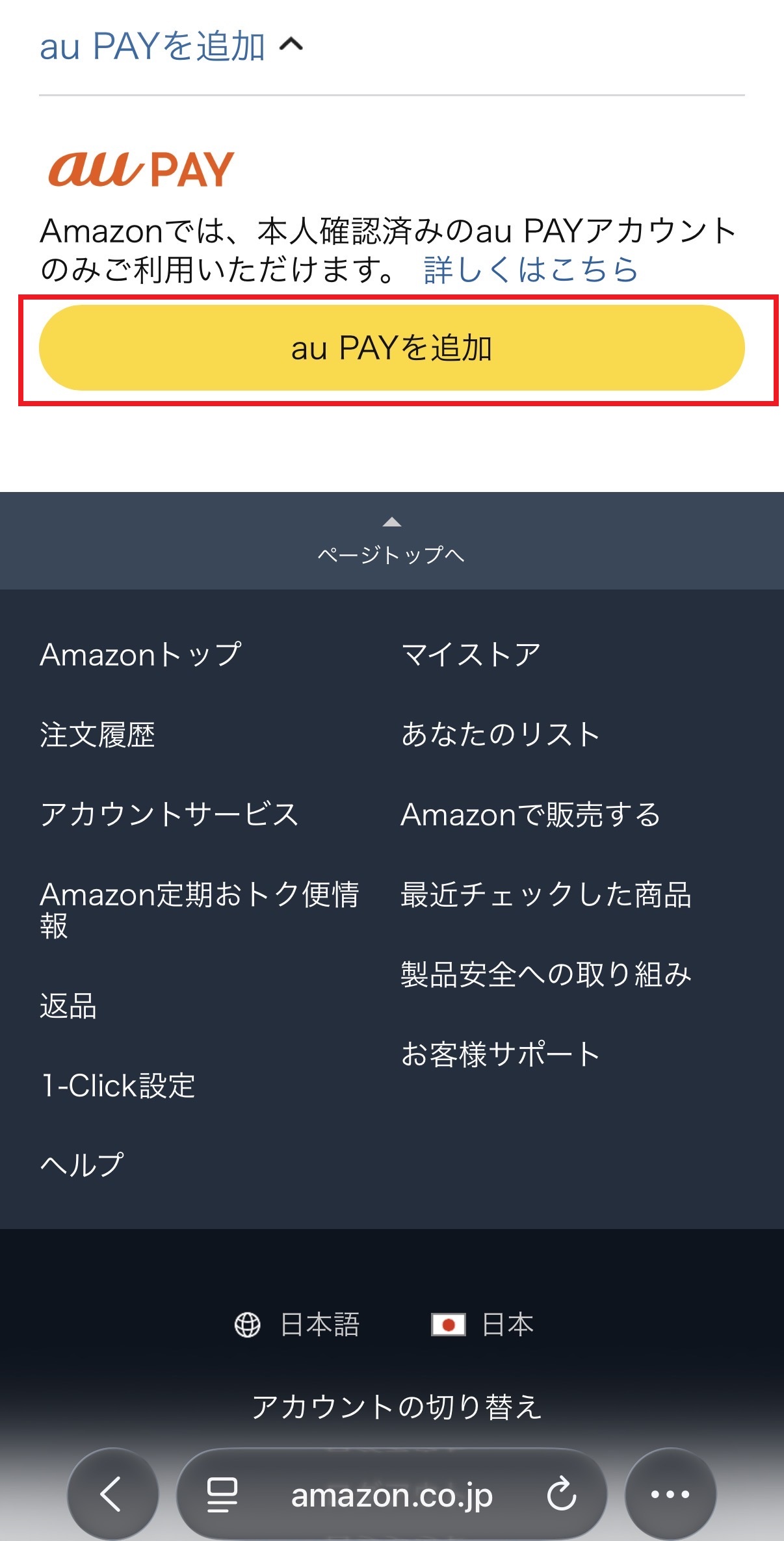 Amazonの支払い方法にau PAYが追加sレ多ことを確認してください。