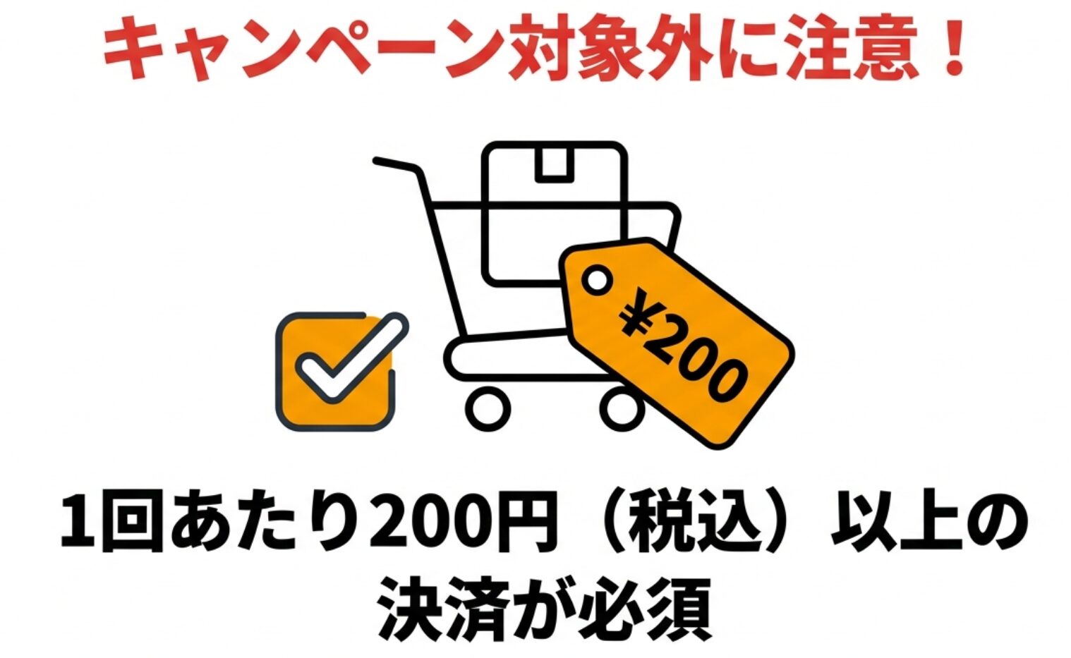 還元を受けるための最低決済額は、1回あたり200円(税込)以上です。