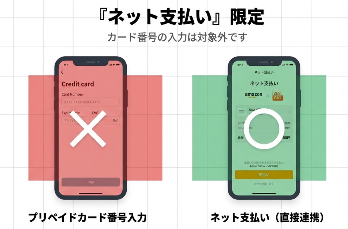 クレジットカードのようにカード番号を入力して決済する方法は対象外となるため、必ずAmazonの支払い方法設定から「au PAY」を直接連携させてください。