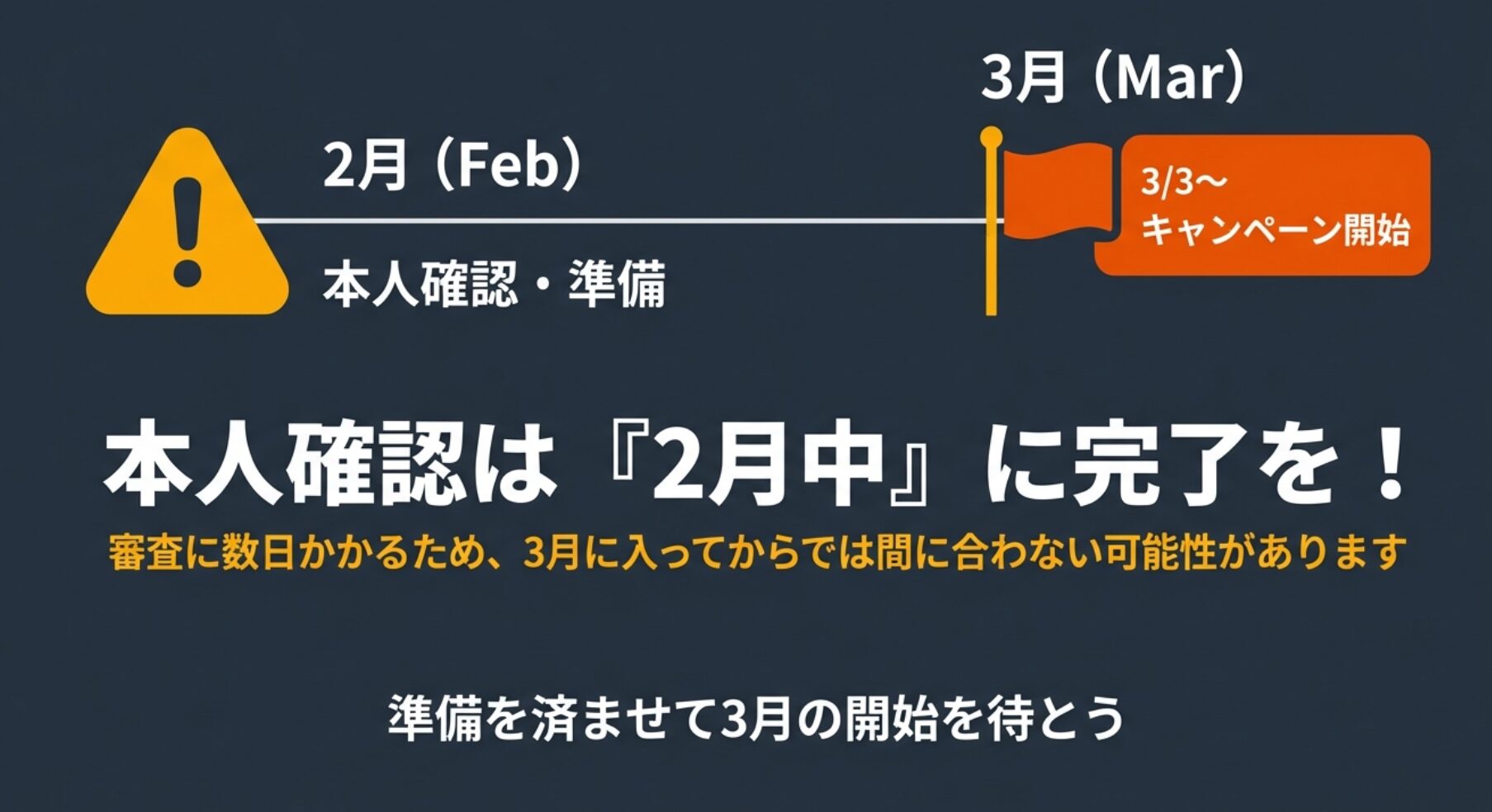 審査には数日かかる場合があるため、キャンペーン開始前の2月中に済ませておくのが鉄則です。