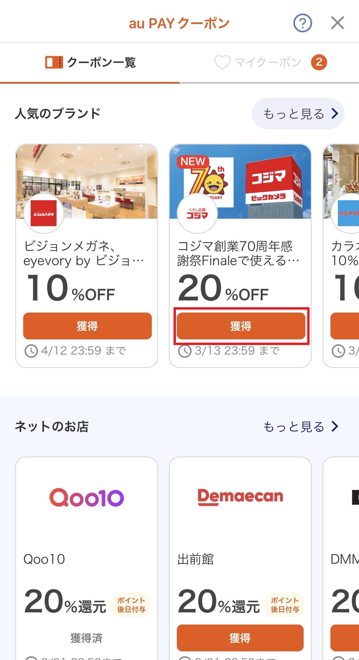 クーポンゲットの方法は、獲得のボタンをタップするだけ。