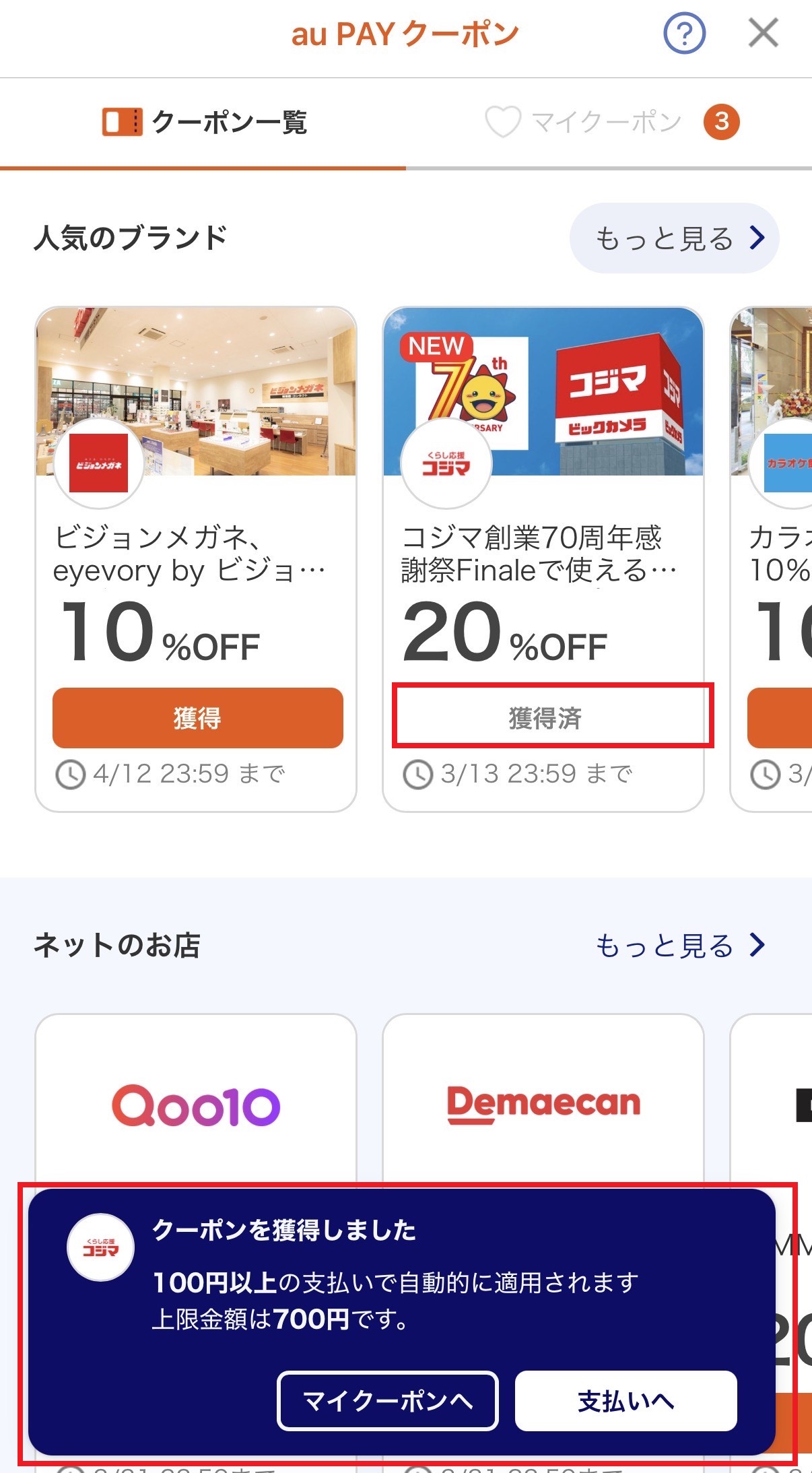 - 使いたいお店のクーポンを「獲得」する。