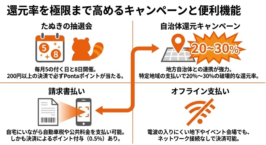 au PAYは「クーポン」の配布頻度と「自治体キャンペーン」の規模が非常に大きいのが特徴です。