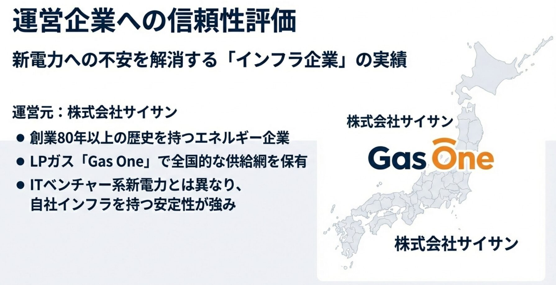 新電力の中には倒産や撤退が心配される会社もありますが、エネワンでんきの運営元は、創業80年以上の歴史を持つガス供給の老舗「株式会社サイサン」です。