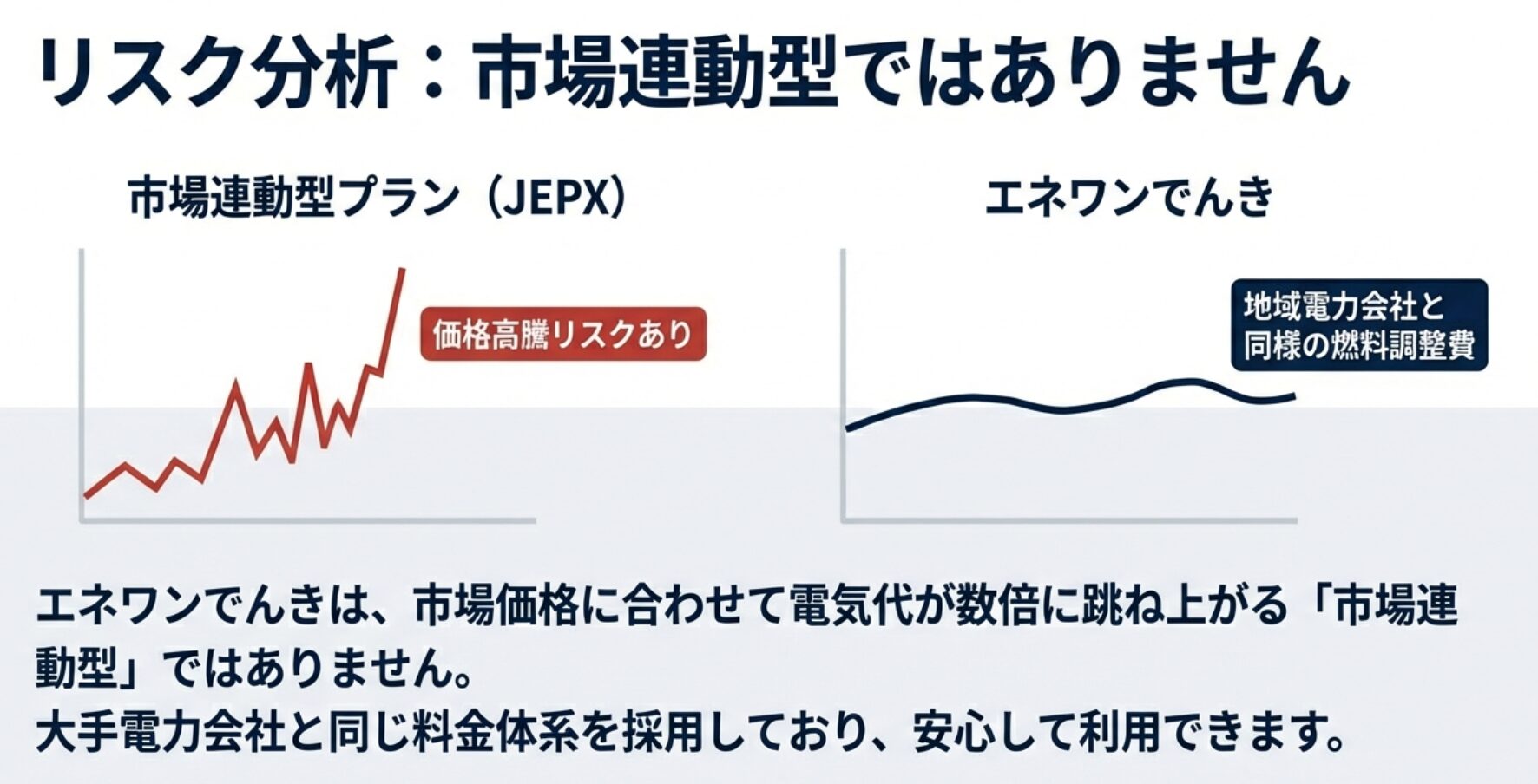 独自の料金体系ではなく、大手電力のプランに準じた構成のため、電力卸売市場の価格高騰に左右されにくい。