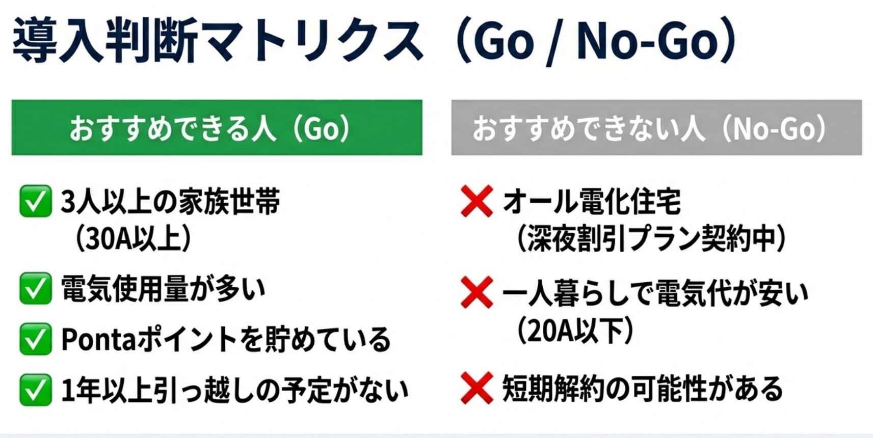 | Pontaポイントを普段から貯めている人 | 1年以内に再度引っ越しや解約の予定がある人 |