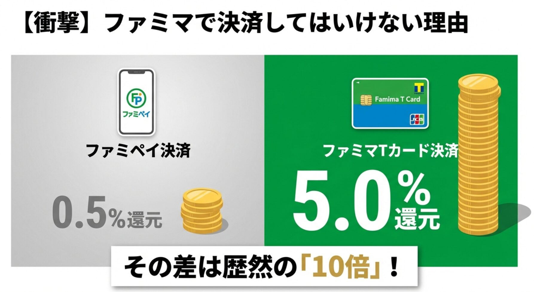この差は10倍です。1,000円の買い物で、ファミペイなら5円分、ファミマTカードなら50円分が還元されることになります。